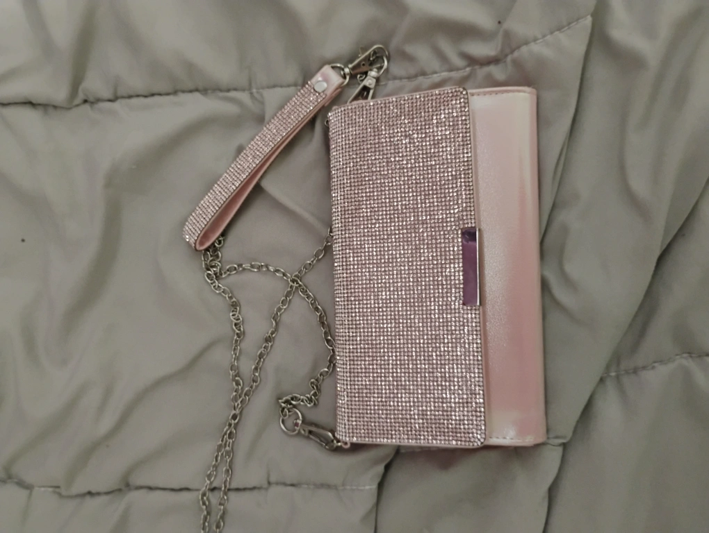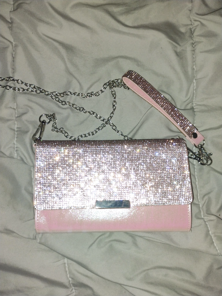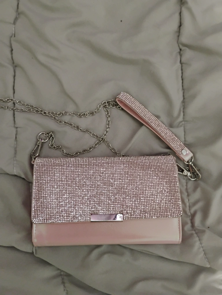 This is a cute pink clutch, covered in rhinestones! It has a silver chain strap and a shorter wrist strap as well. Perfect for a night out or a special occasion not used at all