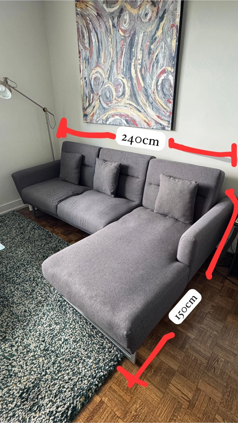 It's a right-facing sofa in great shape and ready for a new home. The dimensions are 240cm in length and 150cm in width.