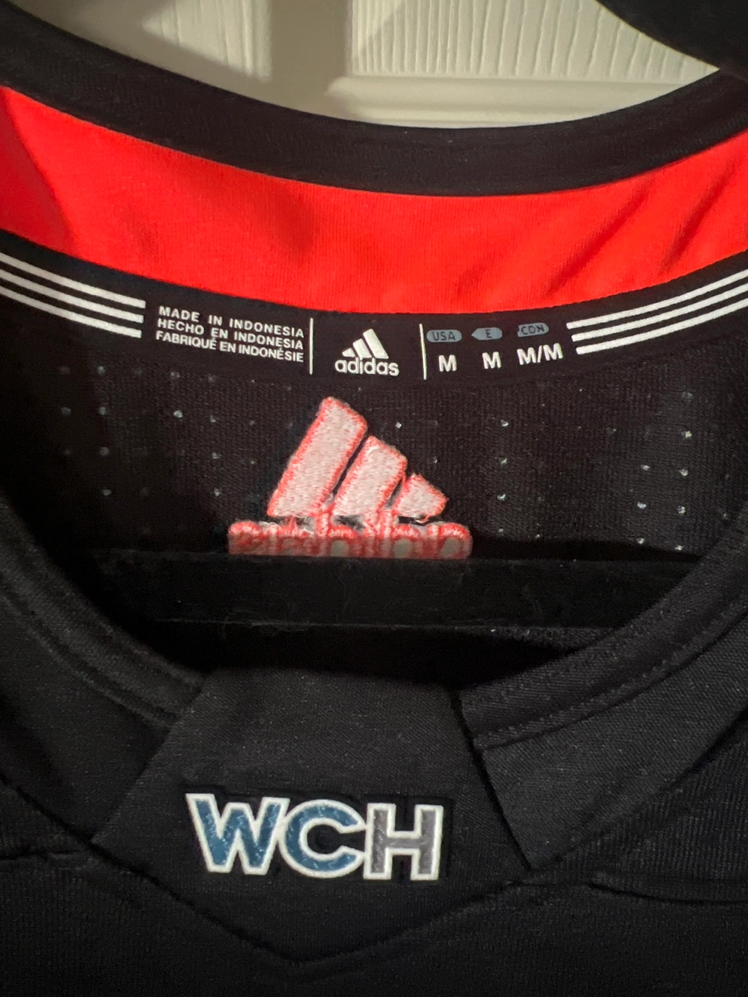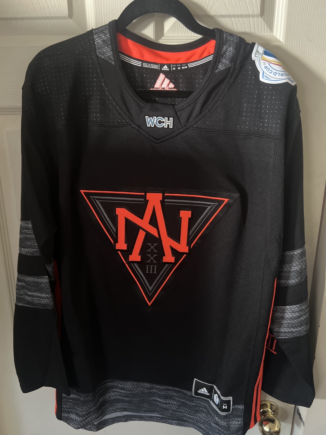 Selling an Adidas World Cup of Hockey 2016 North America jersey in size M. It's black with orange accents and features the WCH logo. Great for any hockey fan!