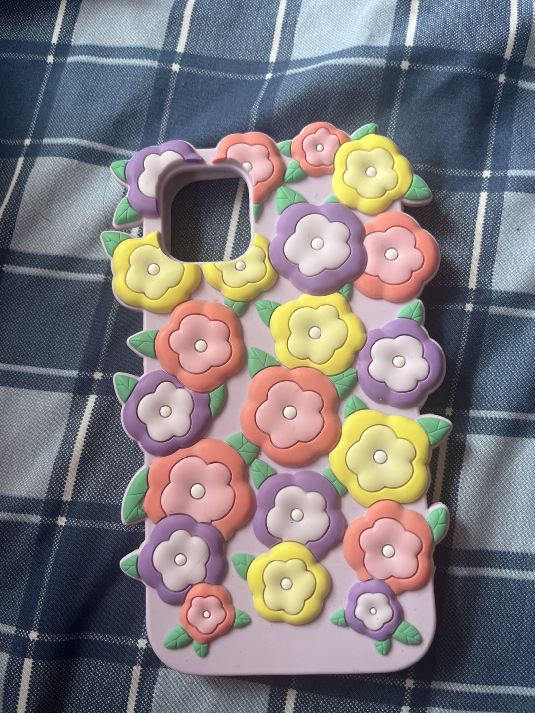 This is a cute floral iPhone case! It features colorful flowers in shades of pink, purple, and yellow. Perfect for adding a touch of spring to your phone