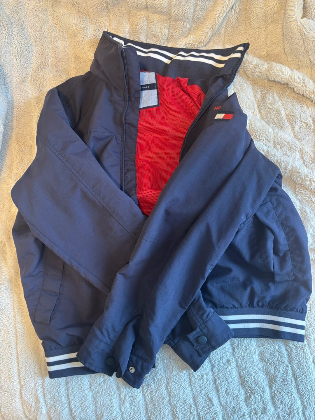 Selling a Tommy Hilfiger jacket in navy blue! It's in great condition and features a red interior lining. Perfect for layering or wearing on its own during cooler days