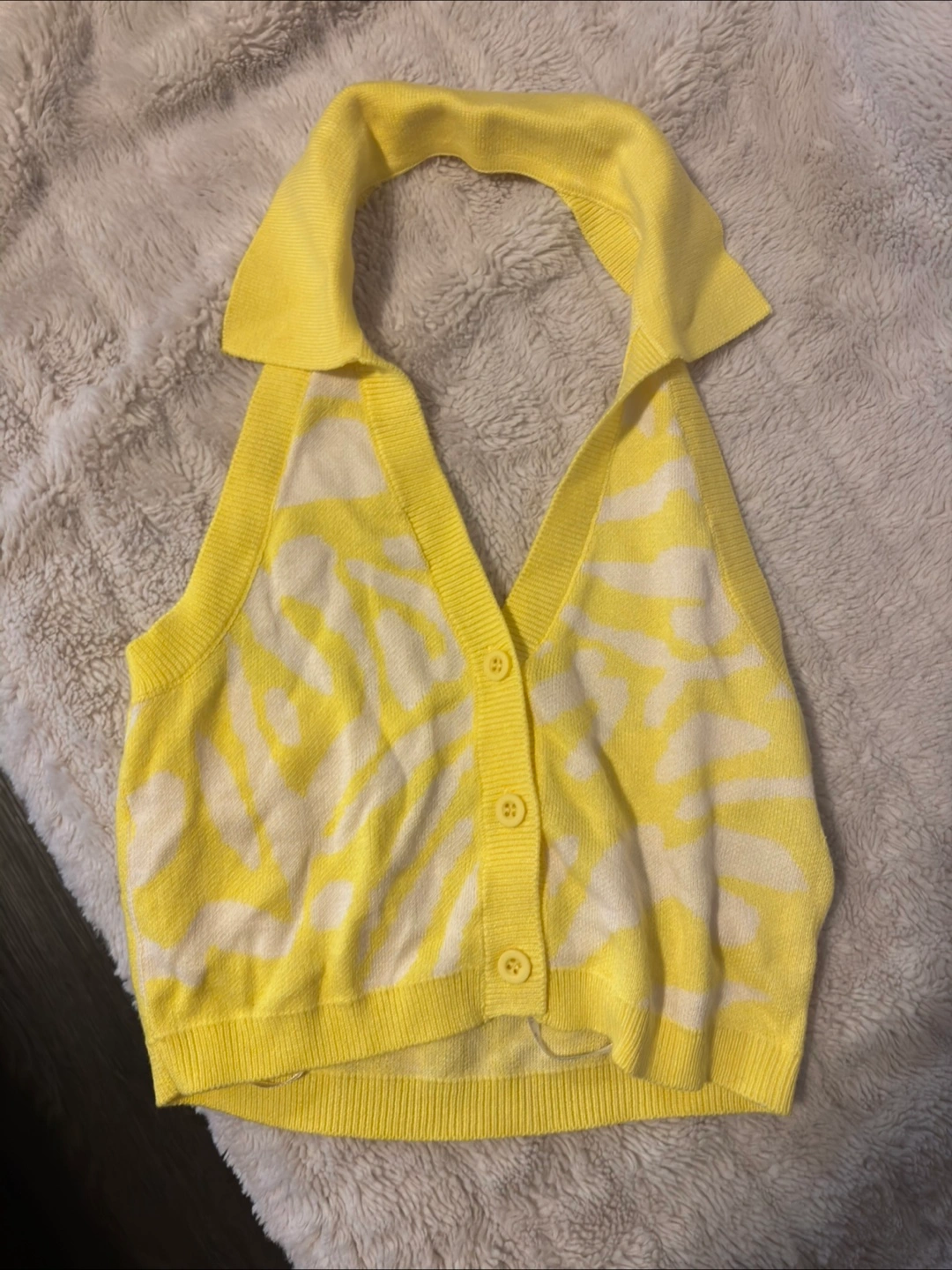 Here's a cute yellow knit top! It's a bright and cheerful piece, perfect for adding a pop of colour to your wardrobe. The material is soft and comfy, making it great for casual wear!