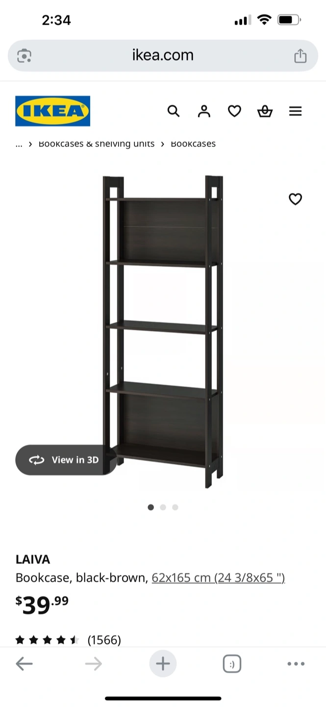 Selling an IKEA LAIVA bookcase in black-brown. It's a simple and sturdy shelving unit, perfect for books or decor. Dimensions are 62x165 cm (24 3/8x65 ")
