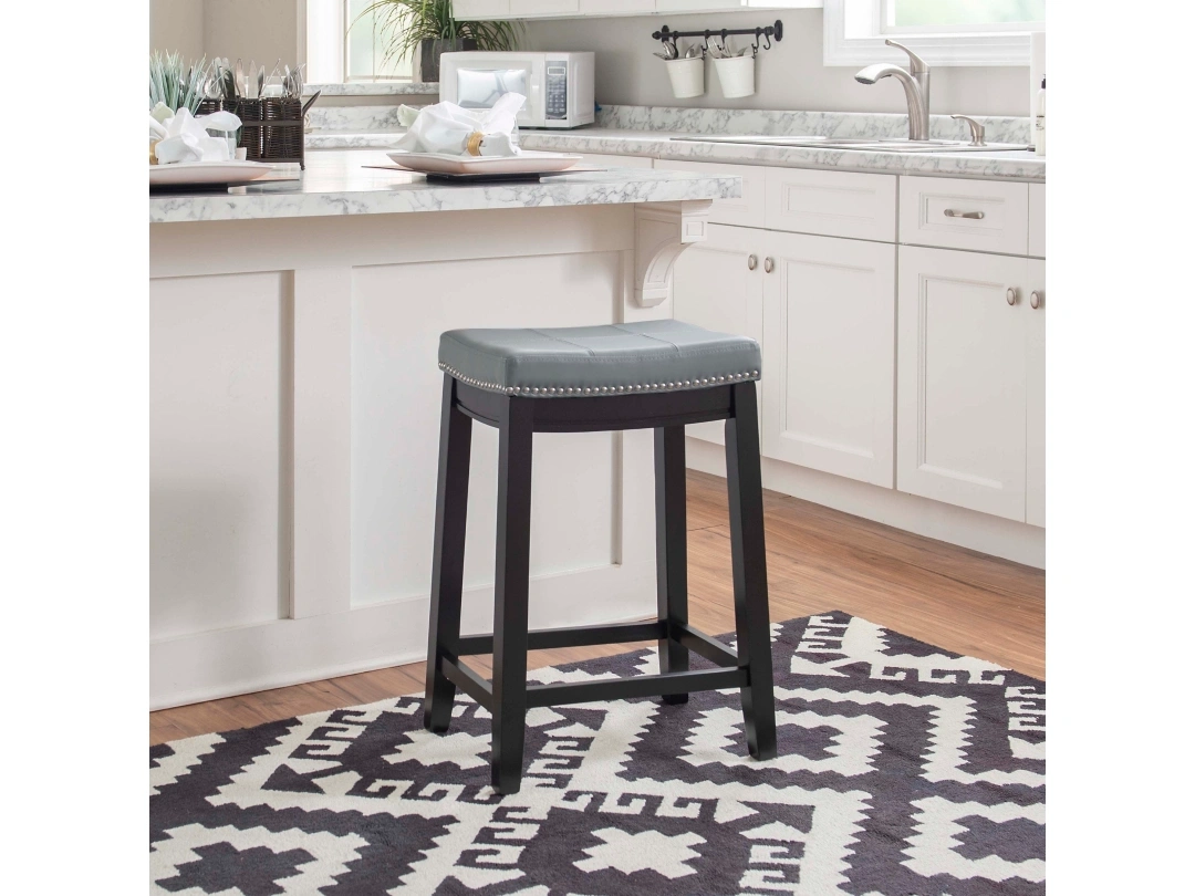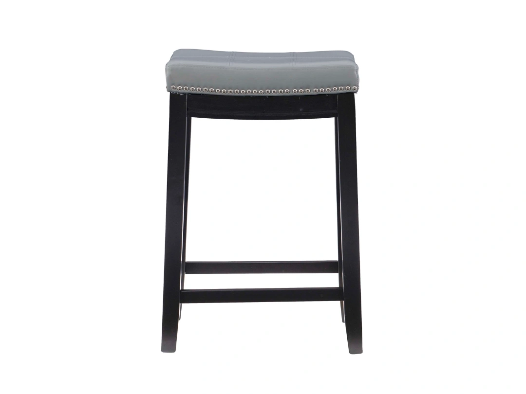 This is a bar stool with a gray faux leather upholstered seat and dark mahogany wooden legs. It features a square seat with nailhead trim. Perfect for a kitchen island or home bar. Sight tare in mesh cover under seat. Doesn't affect seat.