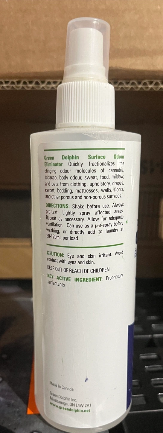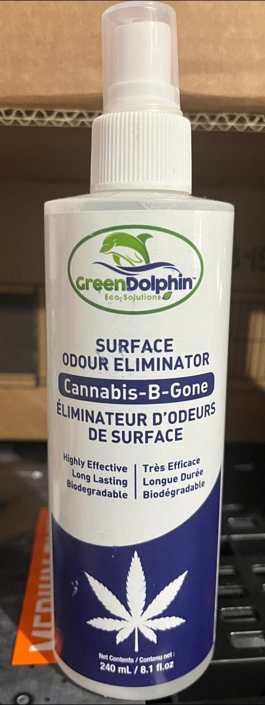 I'm selling a bottle of Green Dolphin Cannabis-B-Gone Surface Odour Eliminator. It's designed to quickly neutralize clinging odours from cannabis, tobacco, body odour, sweat, food, mildew, and pets from clothing, upholstery, drapes, carpets, bedding, mattresses, walls, floors, and other porous and non-porous surfaces. It's also biodegradable and highly effective. Net contents: 240 mL / 8.1 fl.oz