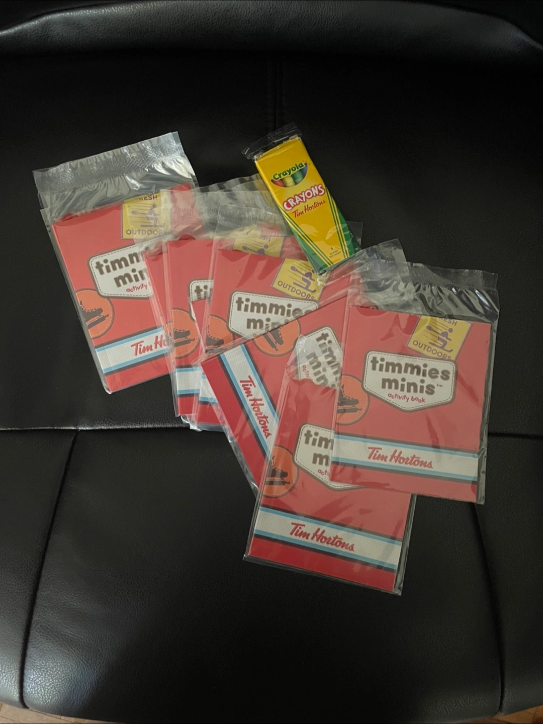 I have a bunch of Tim Hortons Timmies Minis activity books and a pack of Crayola crayons! Perfect for keeping children entertained. Pick up at dufferin station or lansdowne station