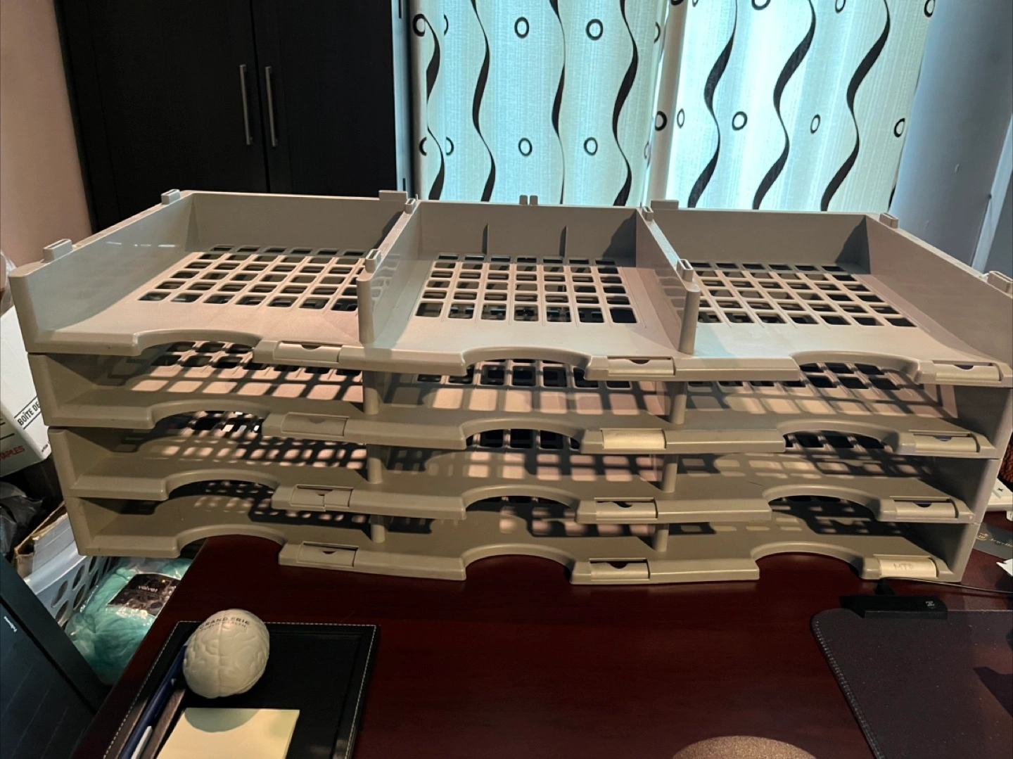 Selling a white plastic stackable document tray organizer. It's in great condition and perfect for keeping your papers tidy and organized! It has multiple tiers for maximum documentation.