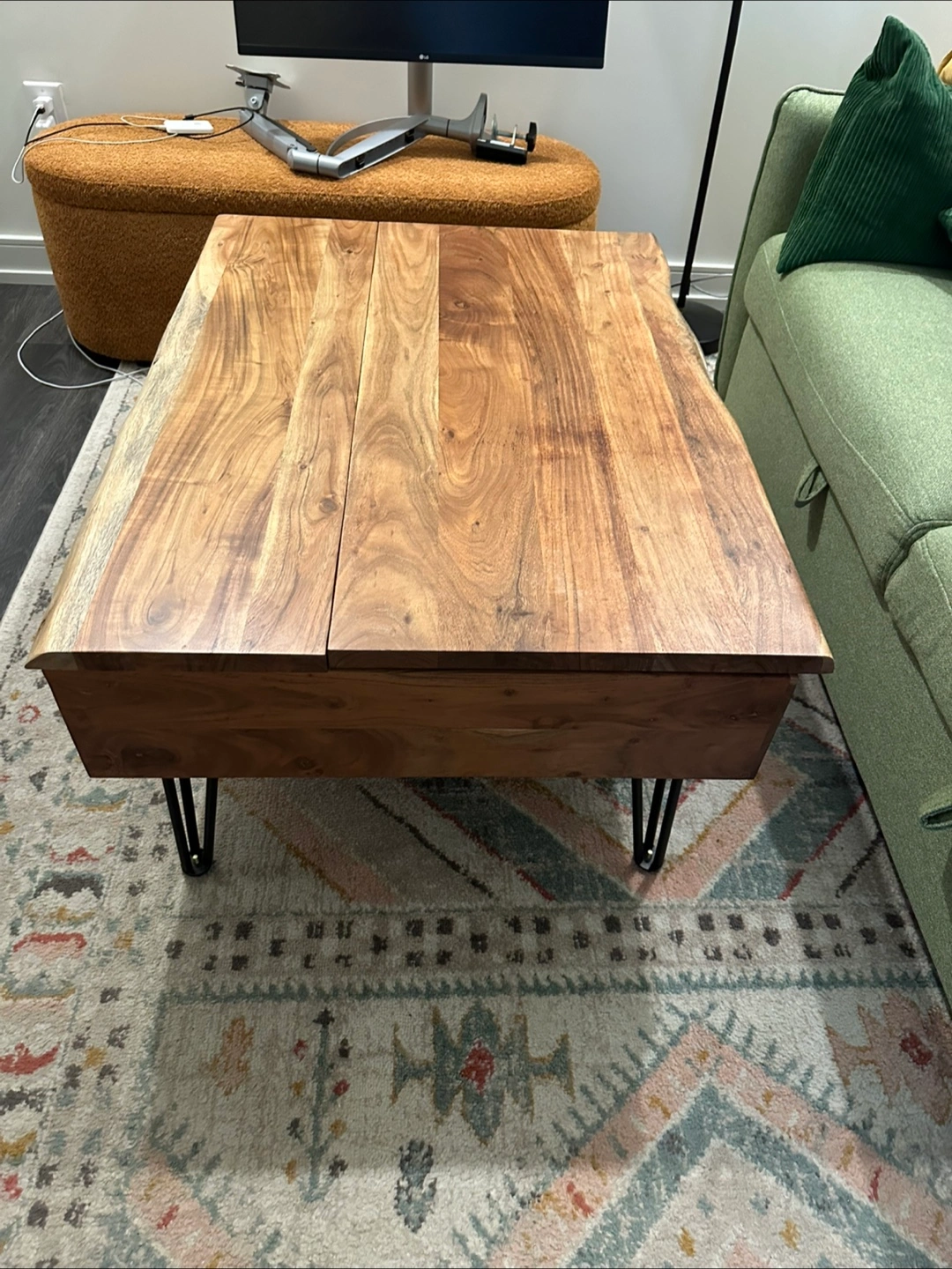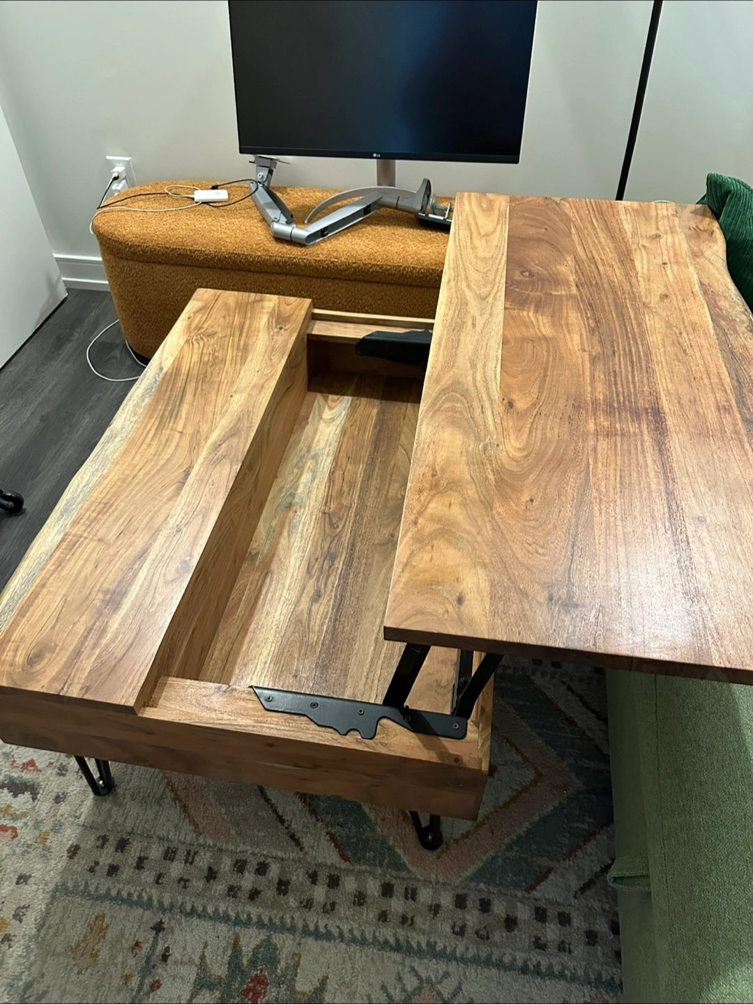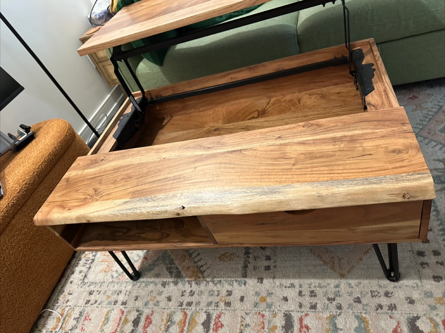Selling a wood lift-top coffee table! It's a great piece for any living room. The lift-top feature is really handy for working or eating while relaxing on the couch. It also has storage inside and a drawer on one side