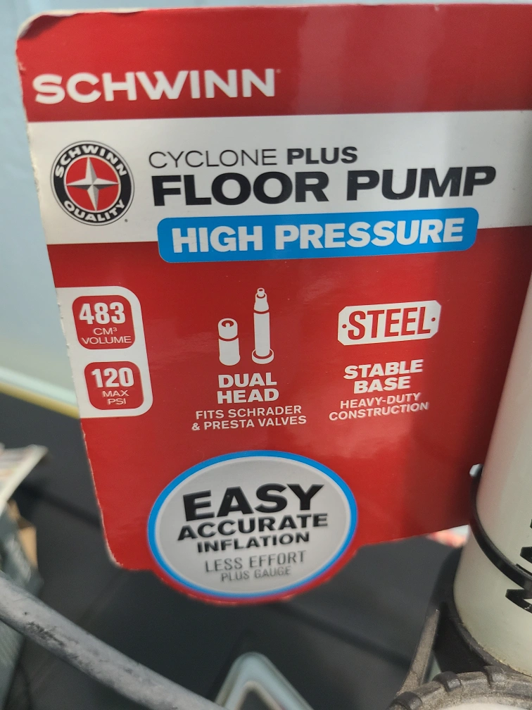 Selling a Schwinn Cyclone Plus floor pump! It's a high-pressure pump with a dual head that fits Schrader and Presta valves. It also features easy, accurate inflation with less effort and a plus gauge. Perfect for keeping your tires properly inflated!