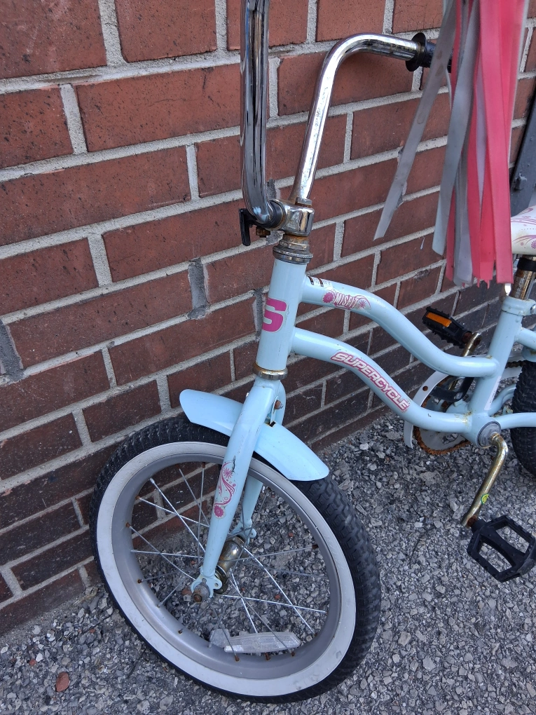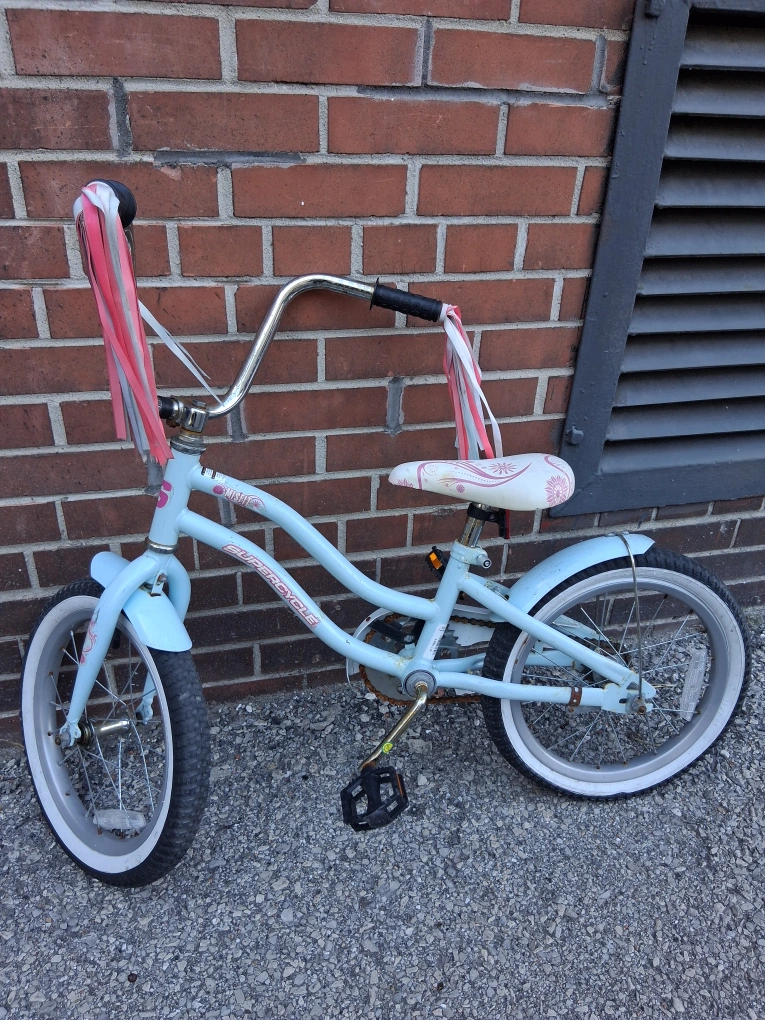 Selling a Supercycle 'Sweetie' girls' bike. It's a cute light blue colour with a 16 x 1.95 tire size. Perfect for a young cyclist! But the back tire is flat, you need to fix it by yourself. Sell as it. Pick up only, No delivery.