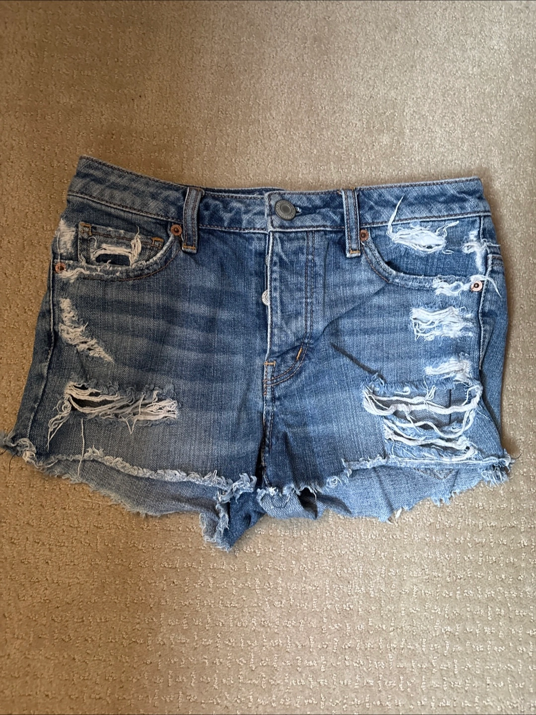 Selling a pair of American Eagle distressed denim shorts in size 2. These shorts are super cute and stylish with a classic denim look and distressed detailing. They're perfect for a casual, summery vibe!