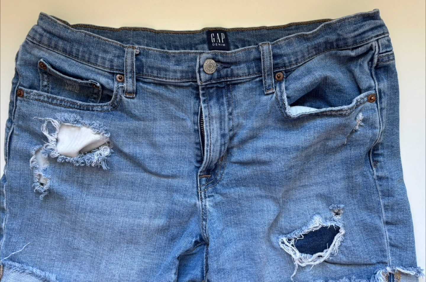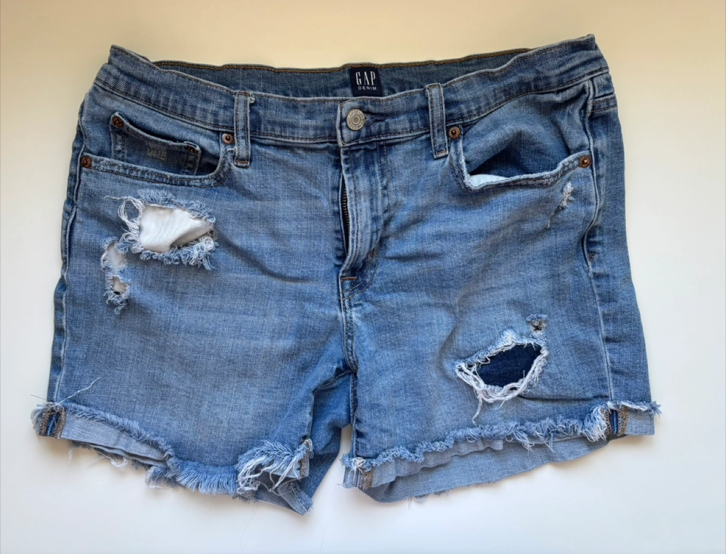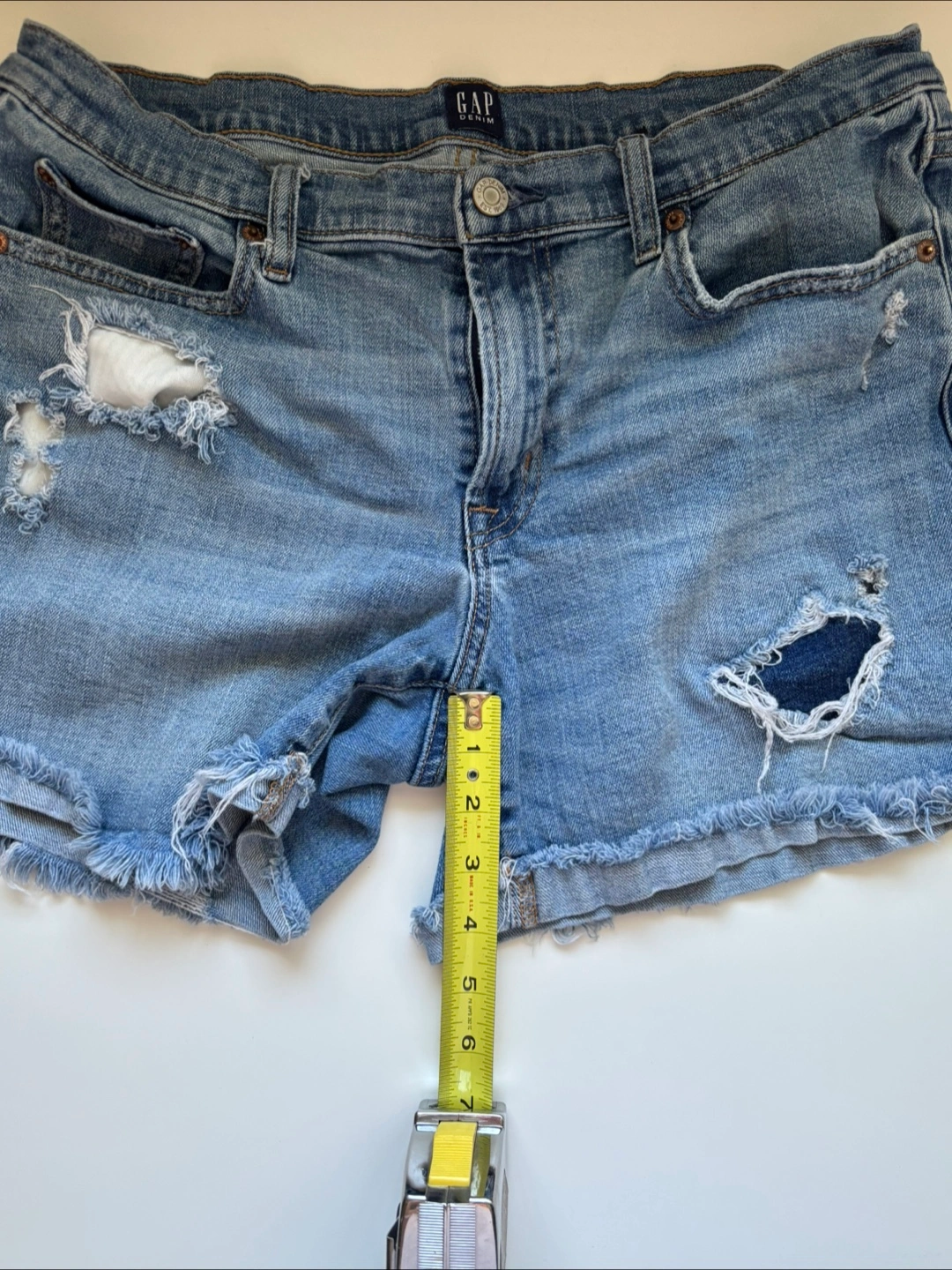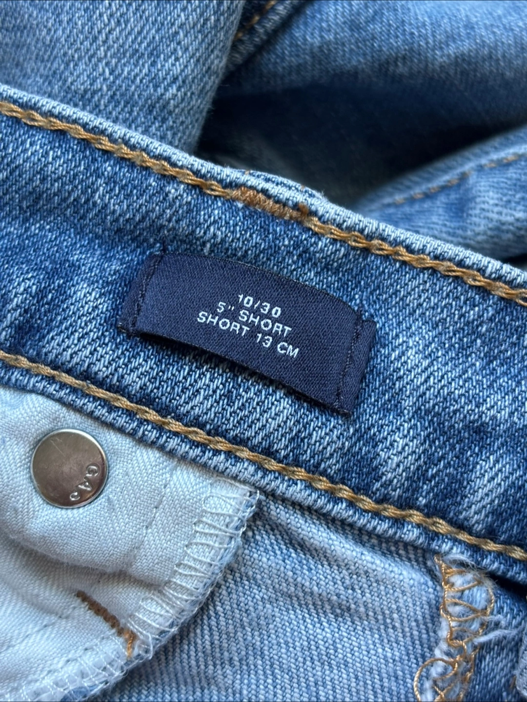 Selling a pair of Gap denim shorts in size 10/30. They have a distressed look with some rips and frayed edges. The inseam is 5" (13 cm).