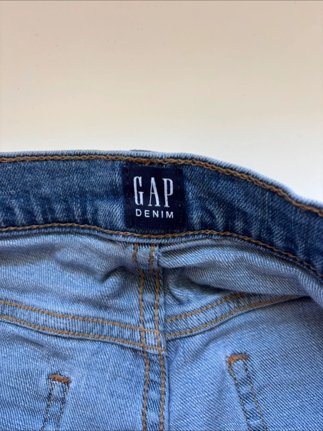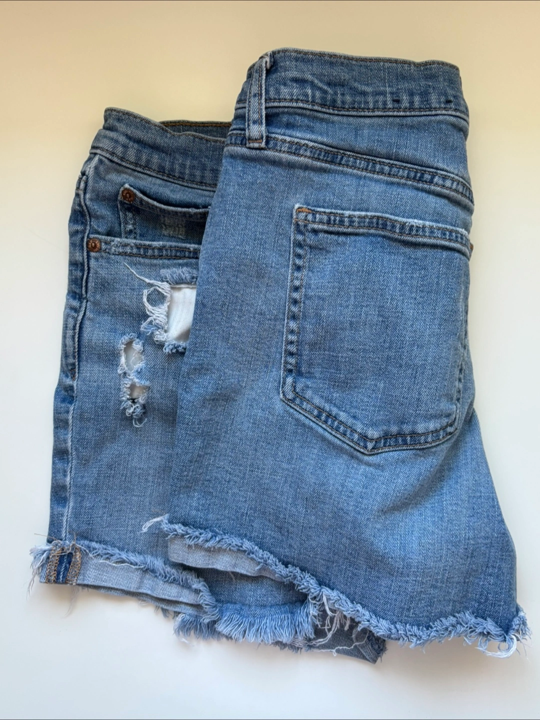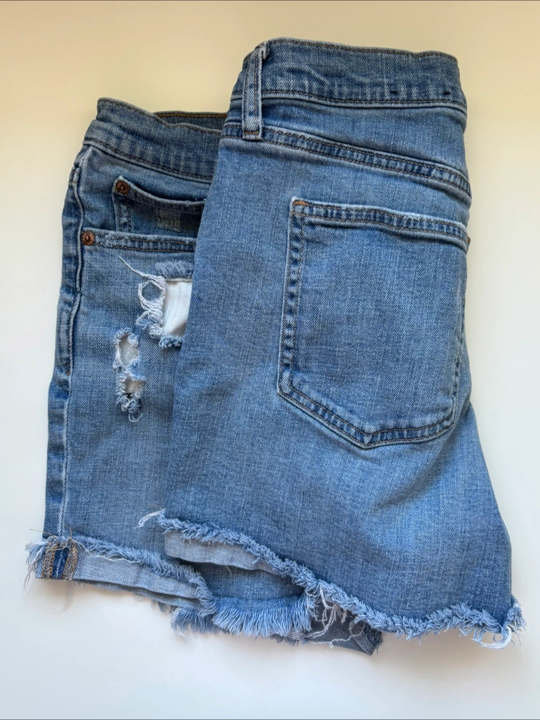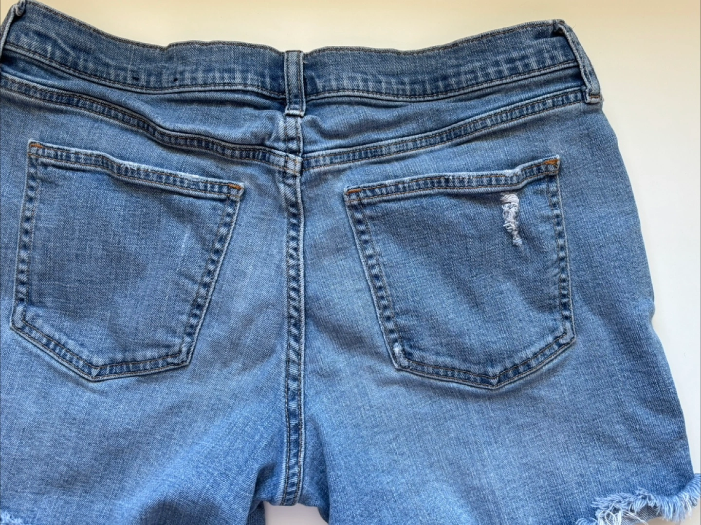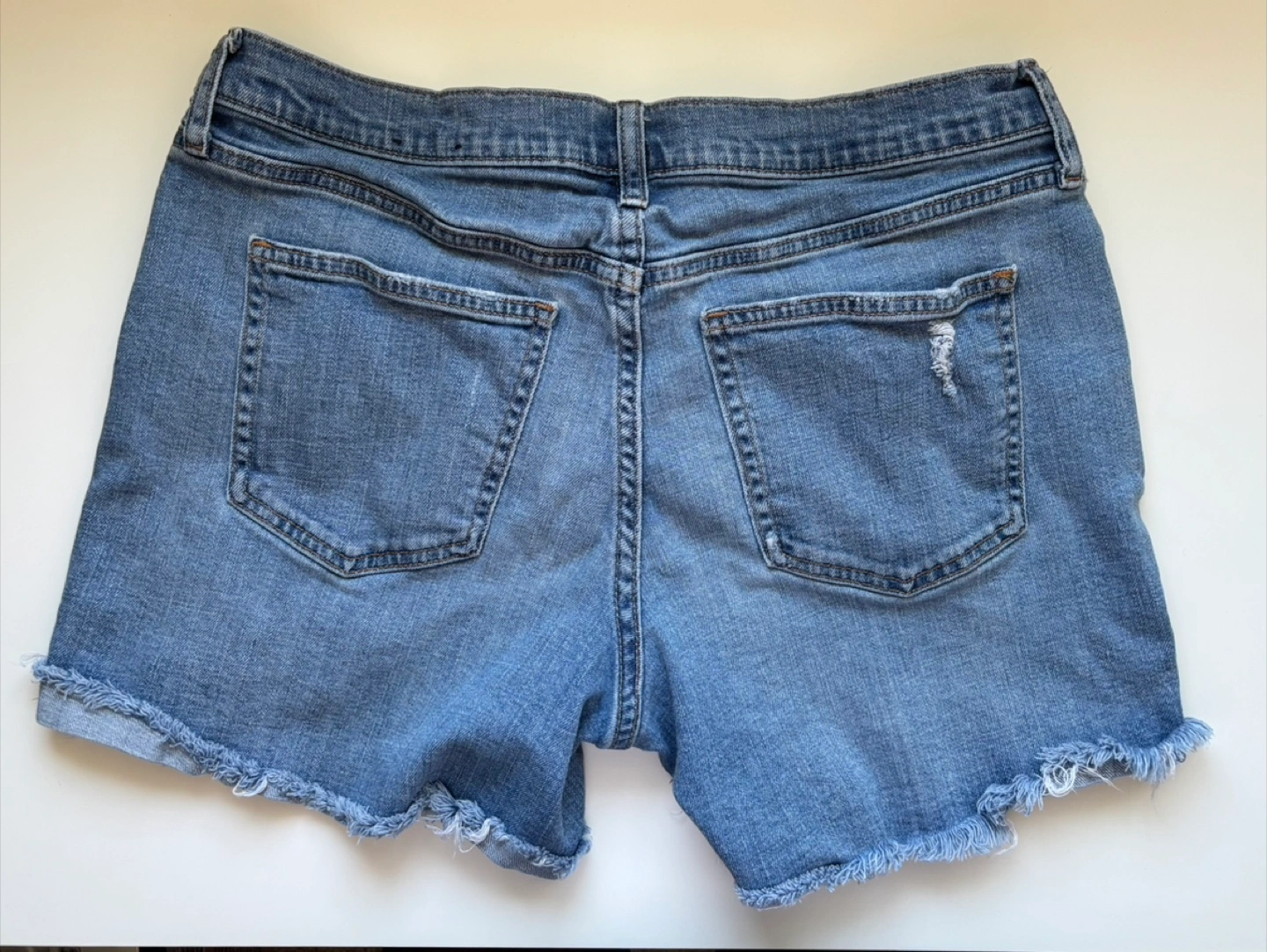 Selling a pair of Gap denim shorts in size 10/30. They have a distressed look with some rips and frayed edges. The inseam is 5" (13 cm).