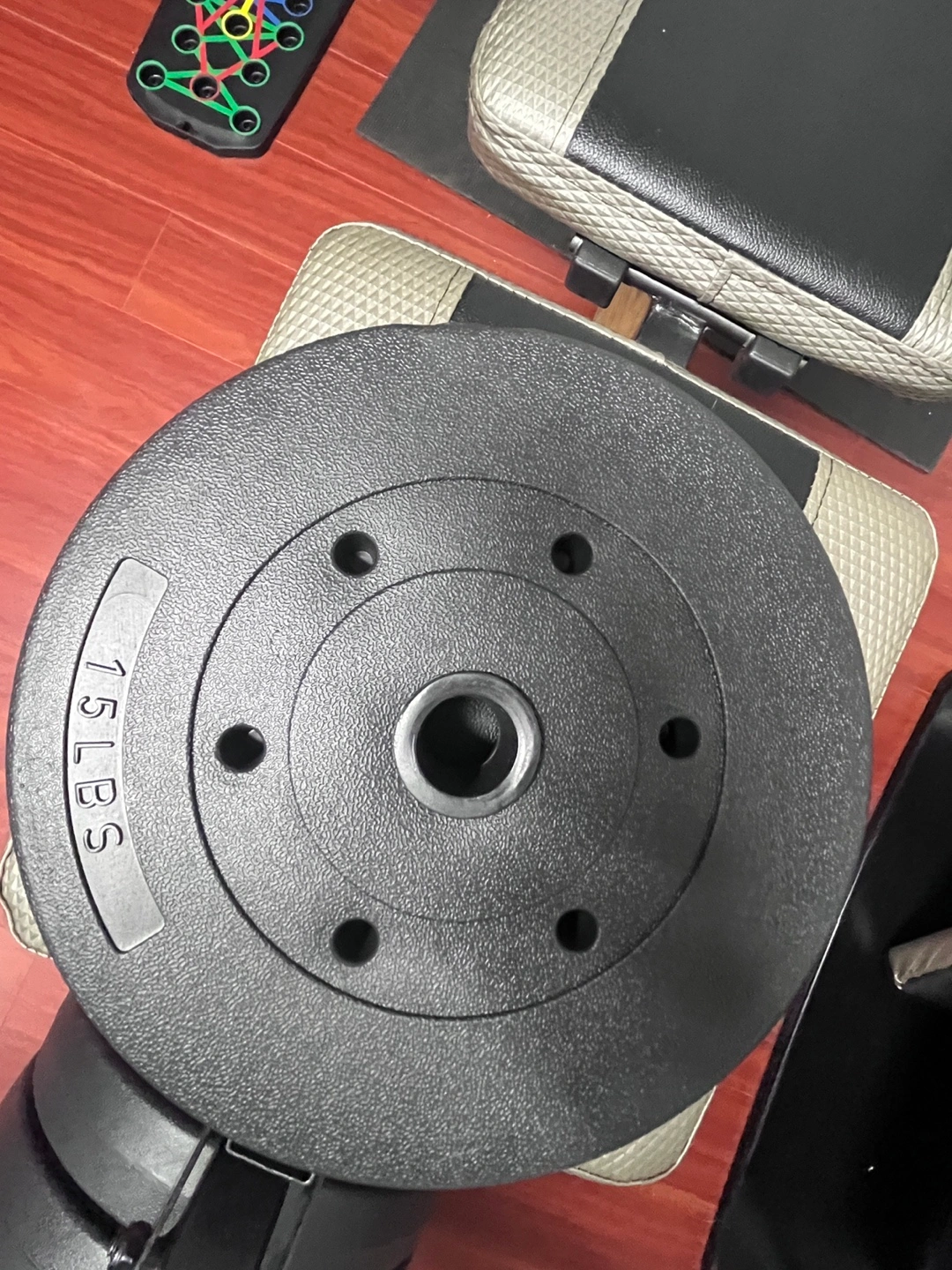CAP Barbell weight bench with 100lbs weight plates. Two 15 lbs plates, two 10 lbs plates, two 5 lbs plates, and clips. Great for home workouts!