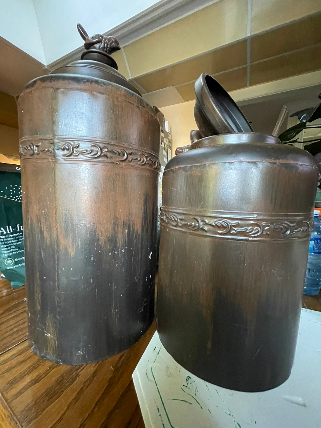 Selling a set of two vintage bronze-coloured storage canisters. They have a unique design with decorative detailing around the top. Perfect for adding a touch of vintage charm to your kitchen or pantry!
