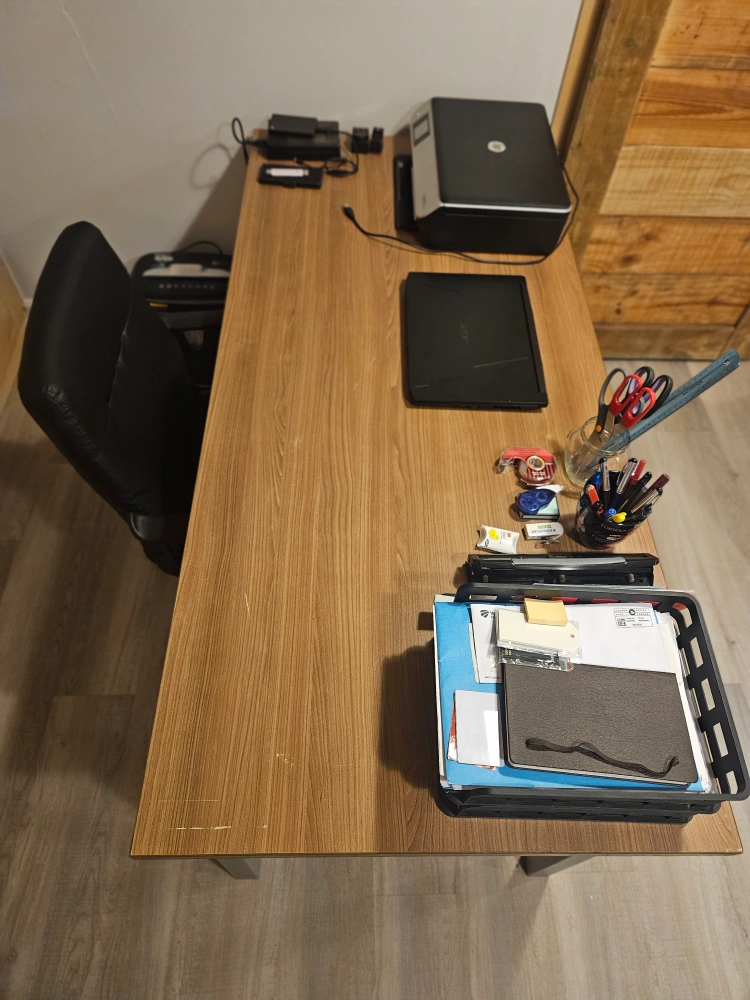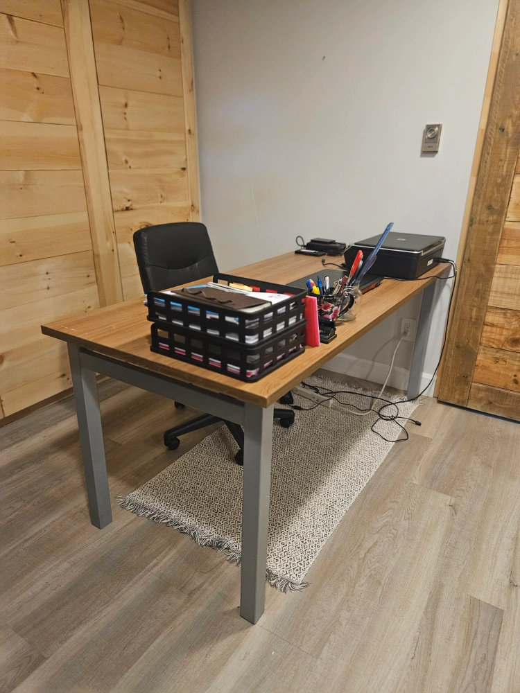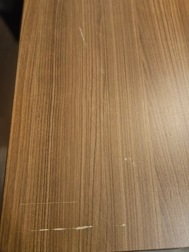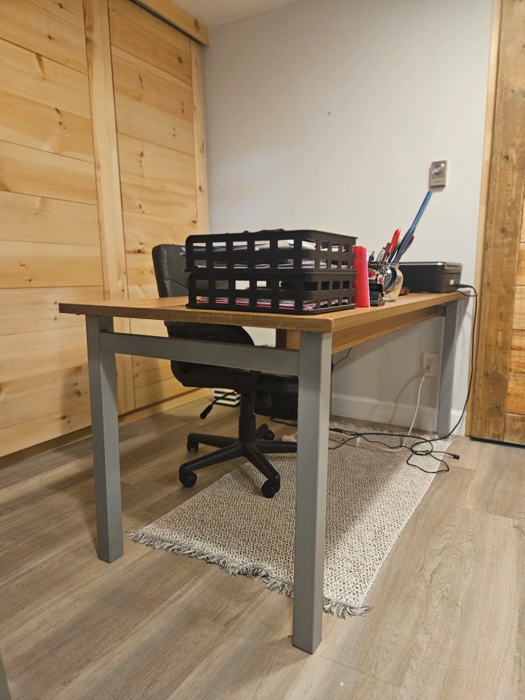 23Selling a wooden desk with grey legs. There are some scratches on the surface, but it's still a sturdy and functional piece of furniture. Perfect for a home office or study space