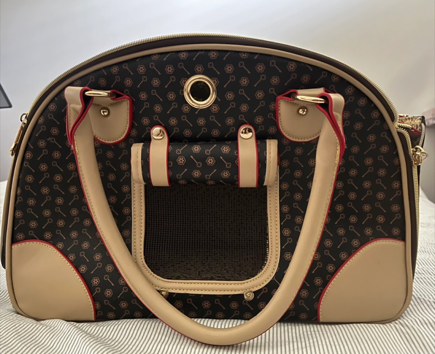 It's in great shape and perfect for small dogs or cats. The dimensions are 17 inches in length, 8 inches in width, and 12 inches in height. It's designed to safely carry pets up to 9 lbs.