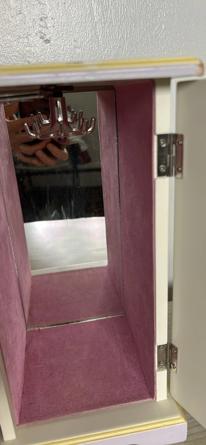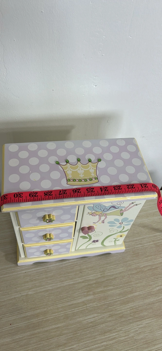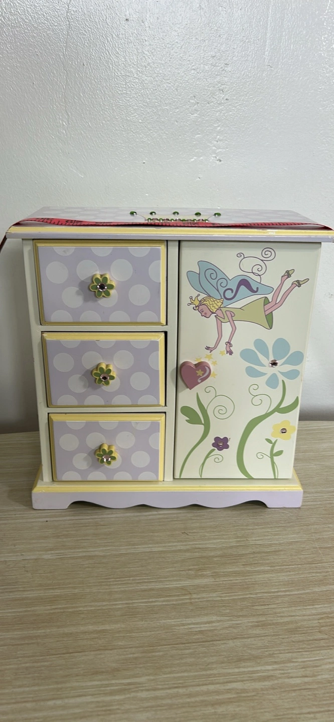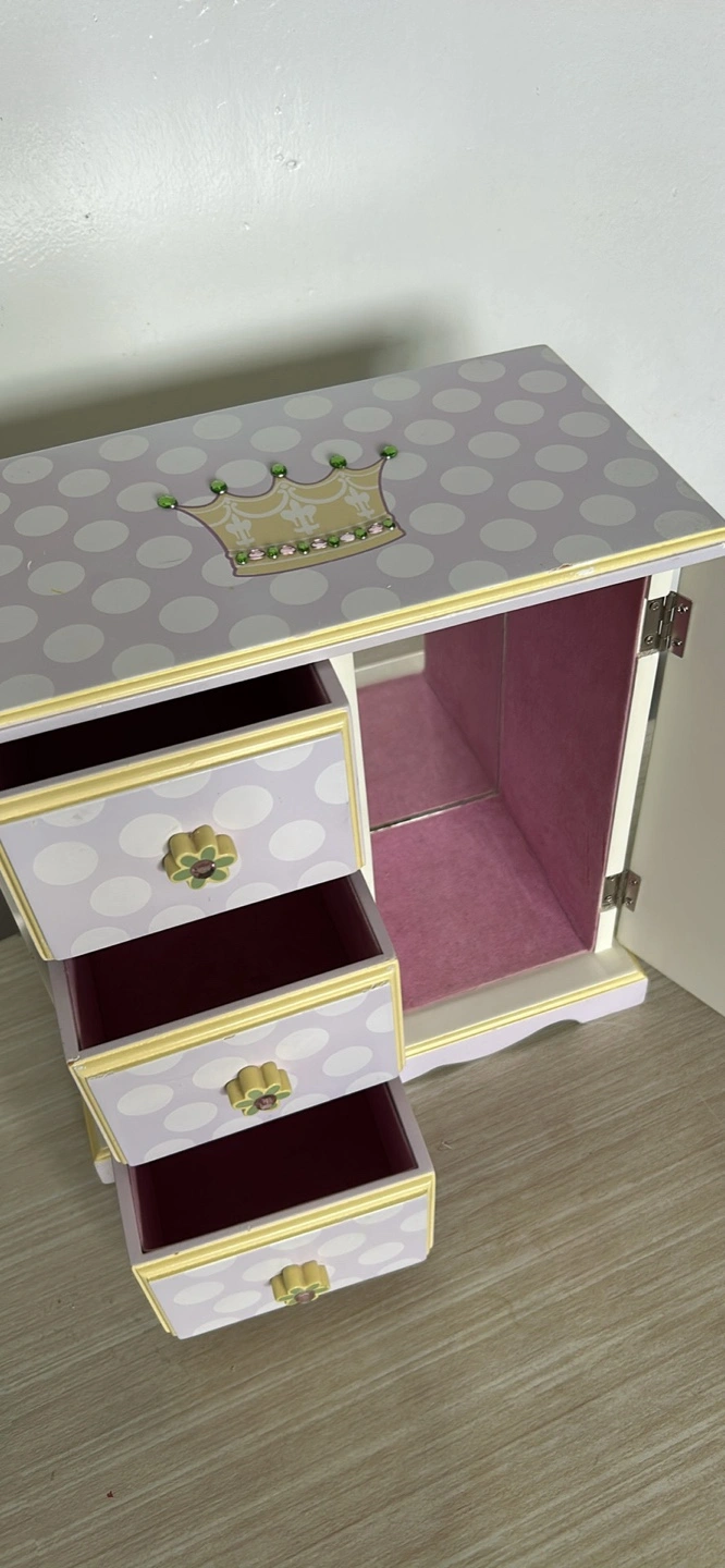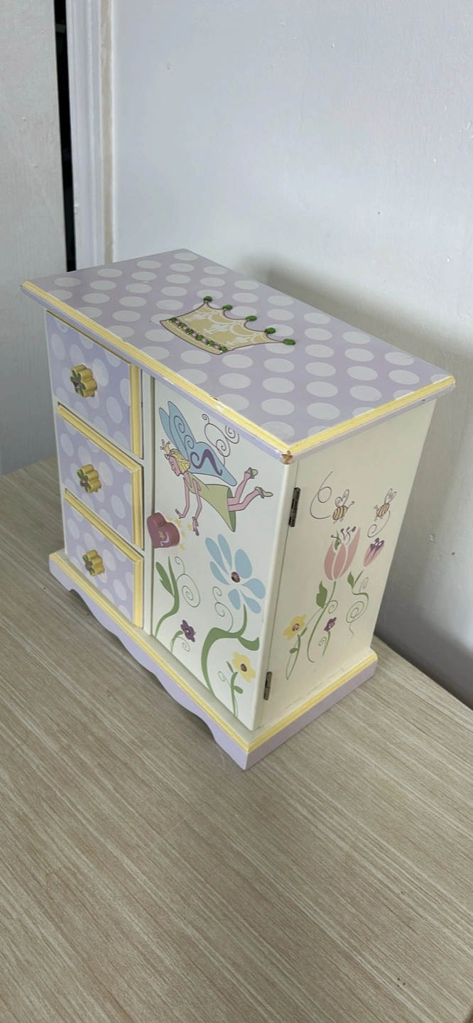A cute little jewelry box for kids! It features three drawers and a side door for hanging necklaces or storing other treasures. The box is decorated with a crown, flowers, and a fairy design in pastel colours like lavender, yellow, and white