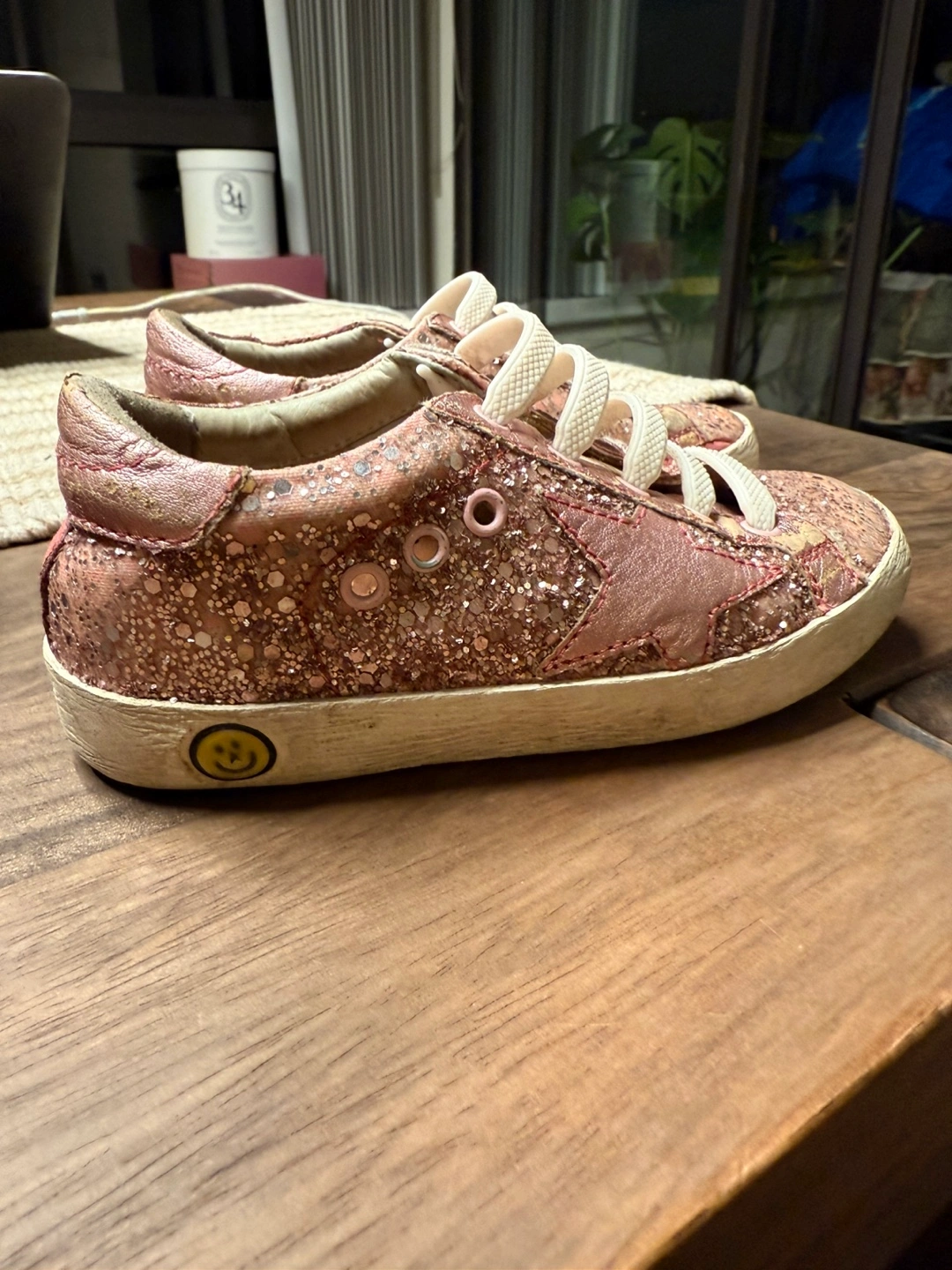 Selling a pair of Golden Goose Superstar sneakers for kids in size 25. They're super cute with a glittery pink design and the iconic star patch. These have been gently used and are ready for a new home!