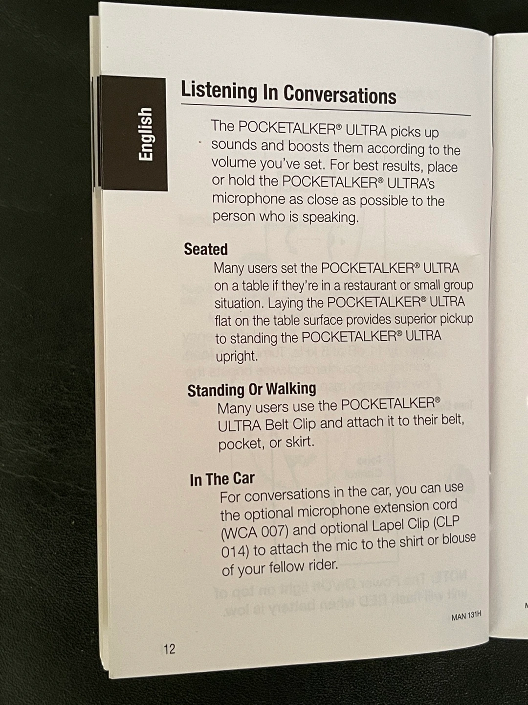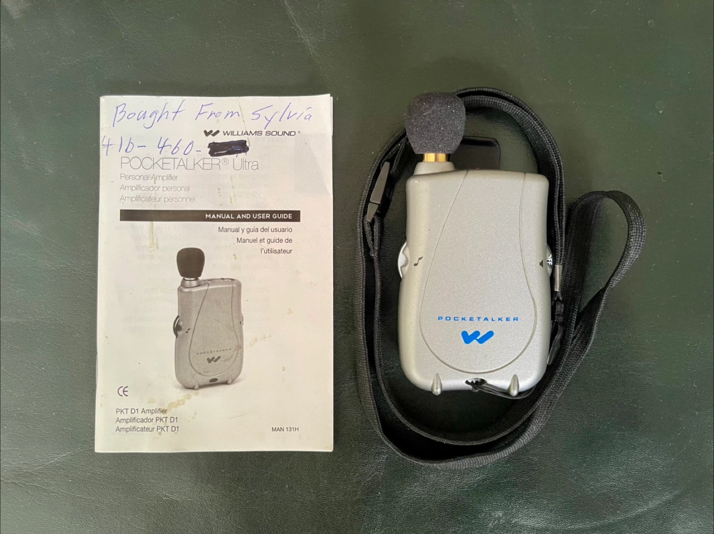 Selling a Williams Sound Pocketalker Ultra personal amplifier. It picks up sounds and boosts them, making conversations easier to hear.