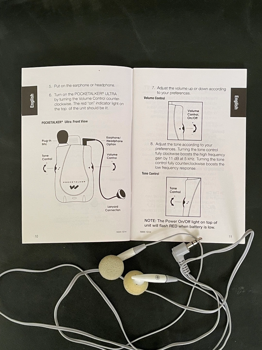 NOTE: earphones provided are not the originals. I recommend providing your own inexpensive over the year headphones to allow the unit to be used optionally with hearing aids.