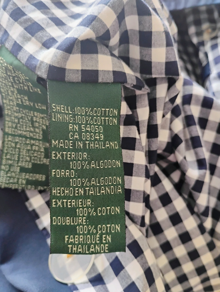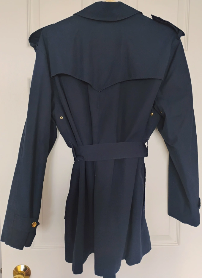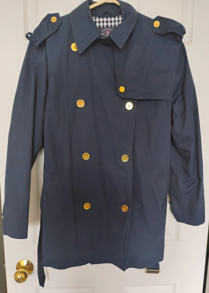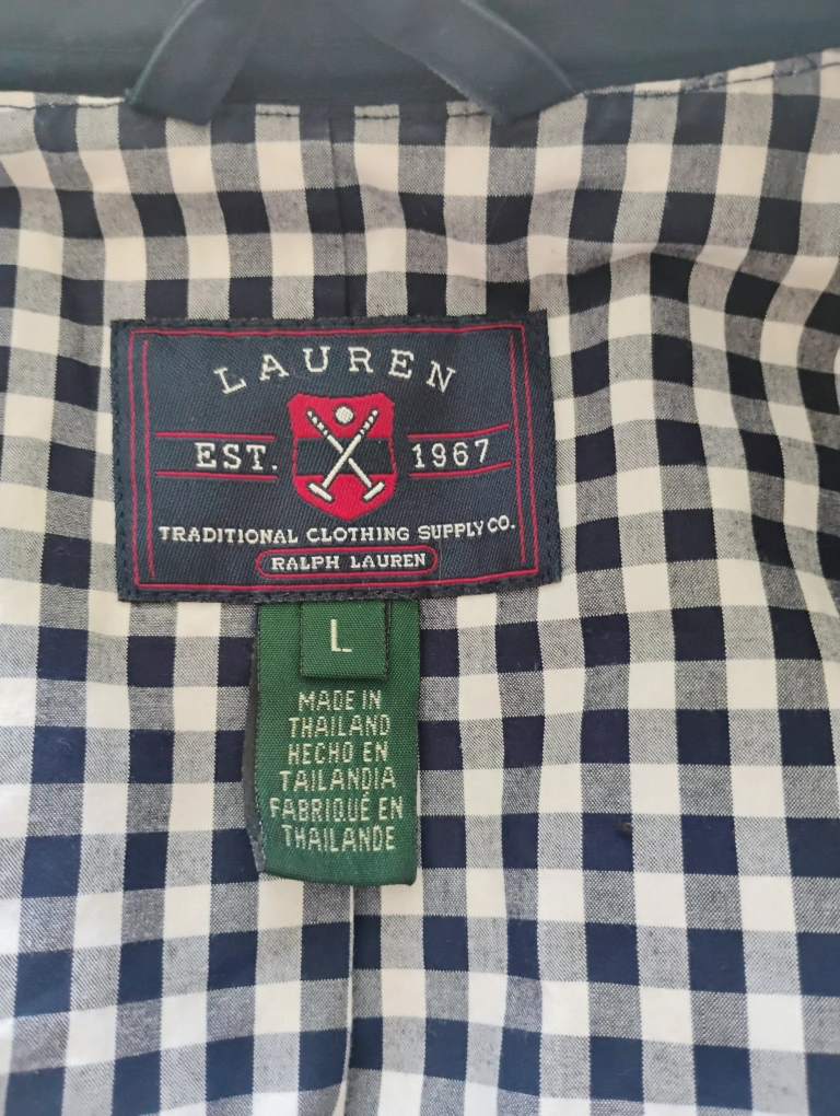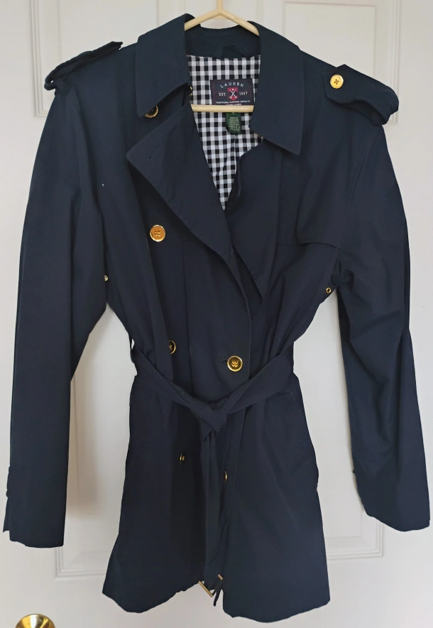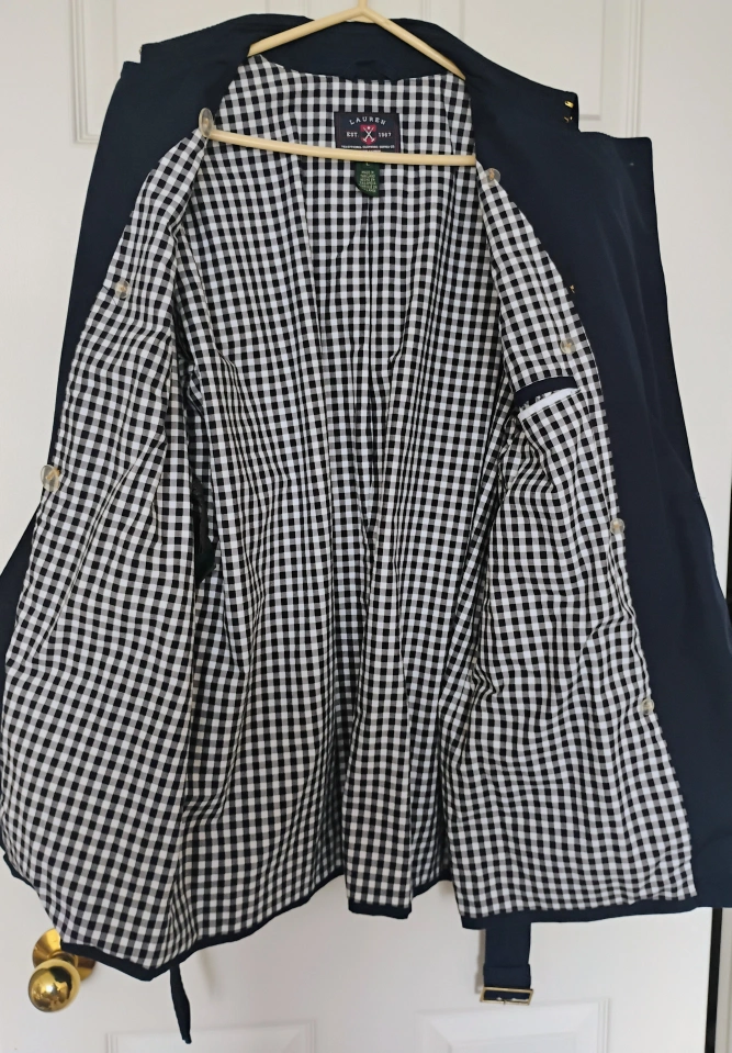 Ralph Lauren Women's navy Raincoat GUC size large. Measures approximately 31 inches in L, 22 inches pit to pit, 19 1/2 inches shoulder to shoulder and 23 1/2 inches sleeve length. Dry cleaning recommended but can be machine washed in cold water delicate cycle. Exterior 100% algodon. Shell and lining 100% cotton. Pick up in Mississauga or downtown Toronto (Union Station).
