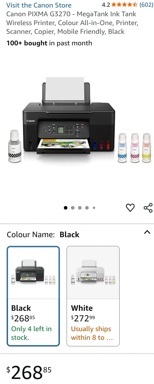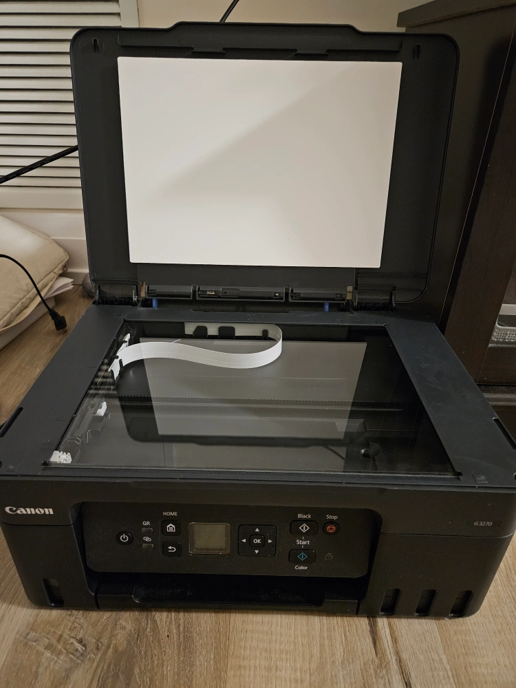 95Selling a Canon G3270 printer in black. It's a great printer for home or office use. It has refillable ink tanks, so you don't have to worry about replacing cartridges all the time. It also has a scanner and copier built in! I've only used it for a short time, so you’ll see there’s still a lot of ink left. I’ll also include a USB cable for direct connection to your computer. Smoke and Pet free home. Cash and pick up only.