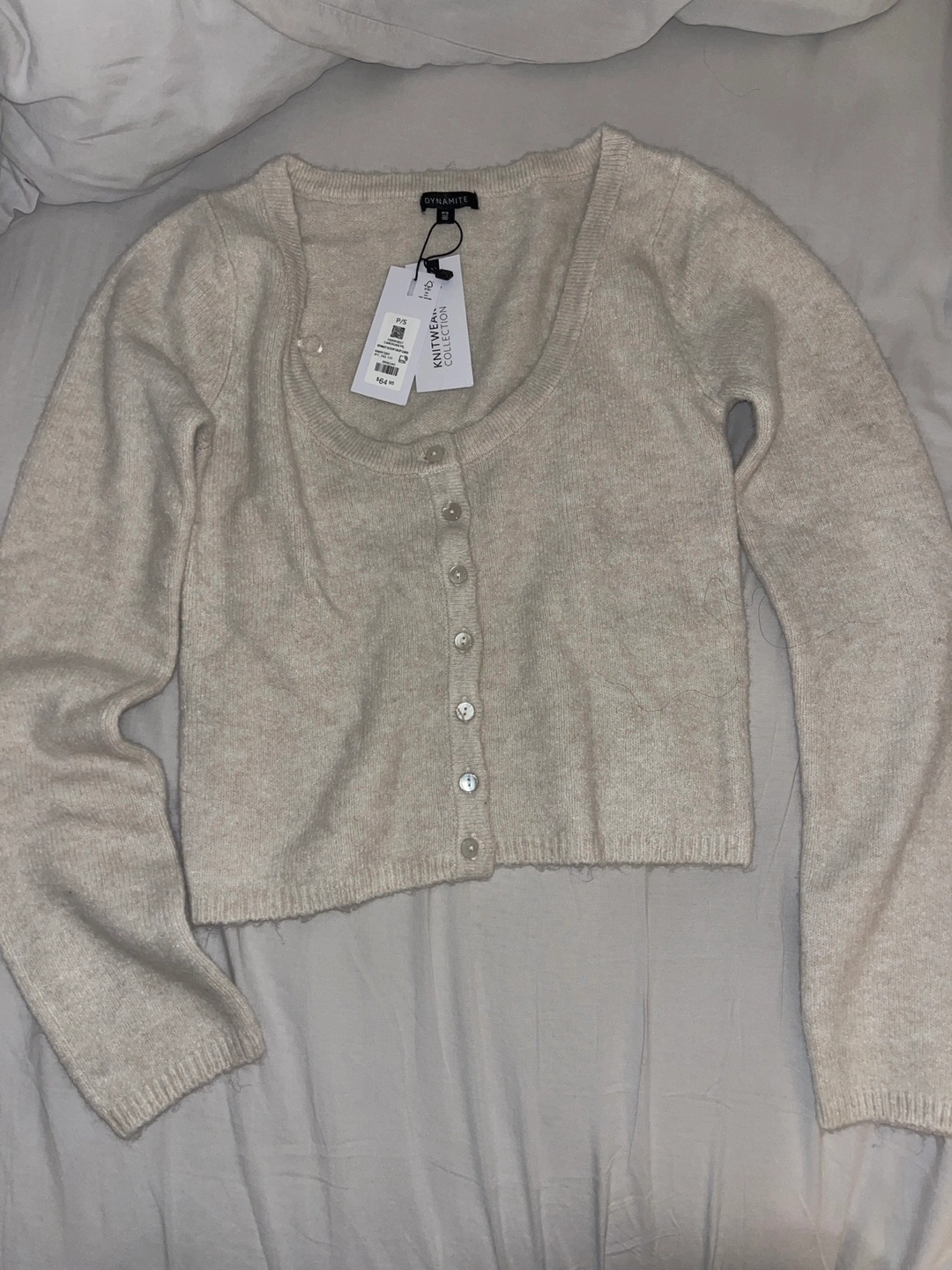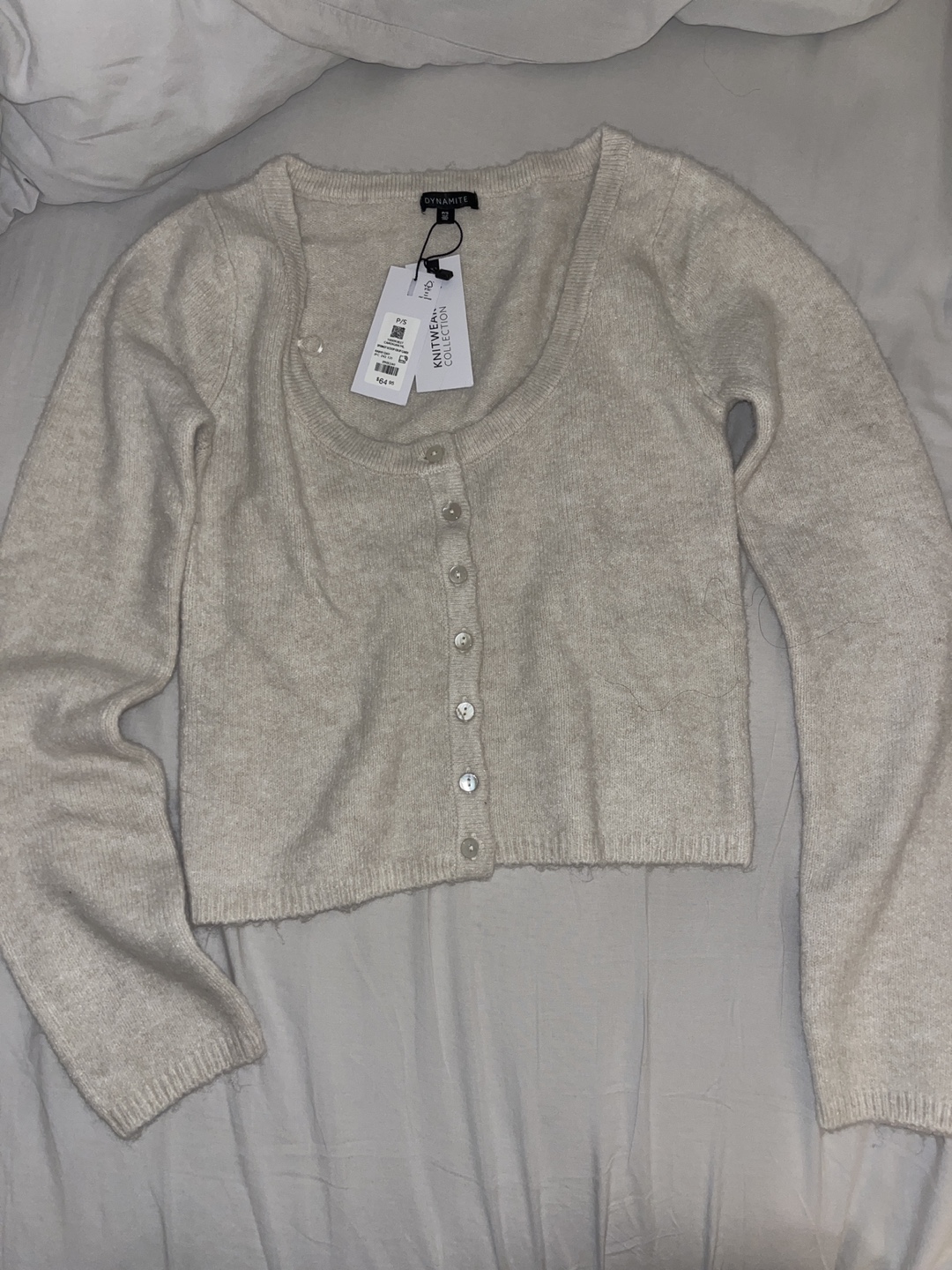 This is a Dynamite Knitwear Collection cardigan in size small. It's a beautiful, neutral colour that would go with anything! It was originally bought for $64.95
