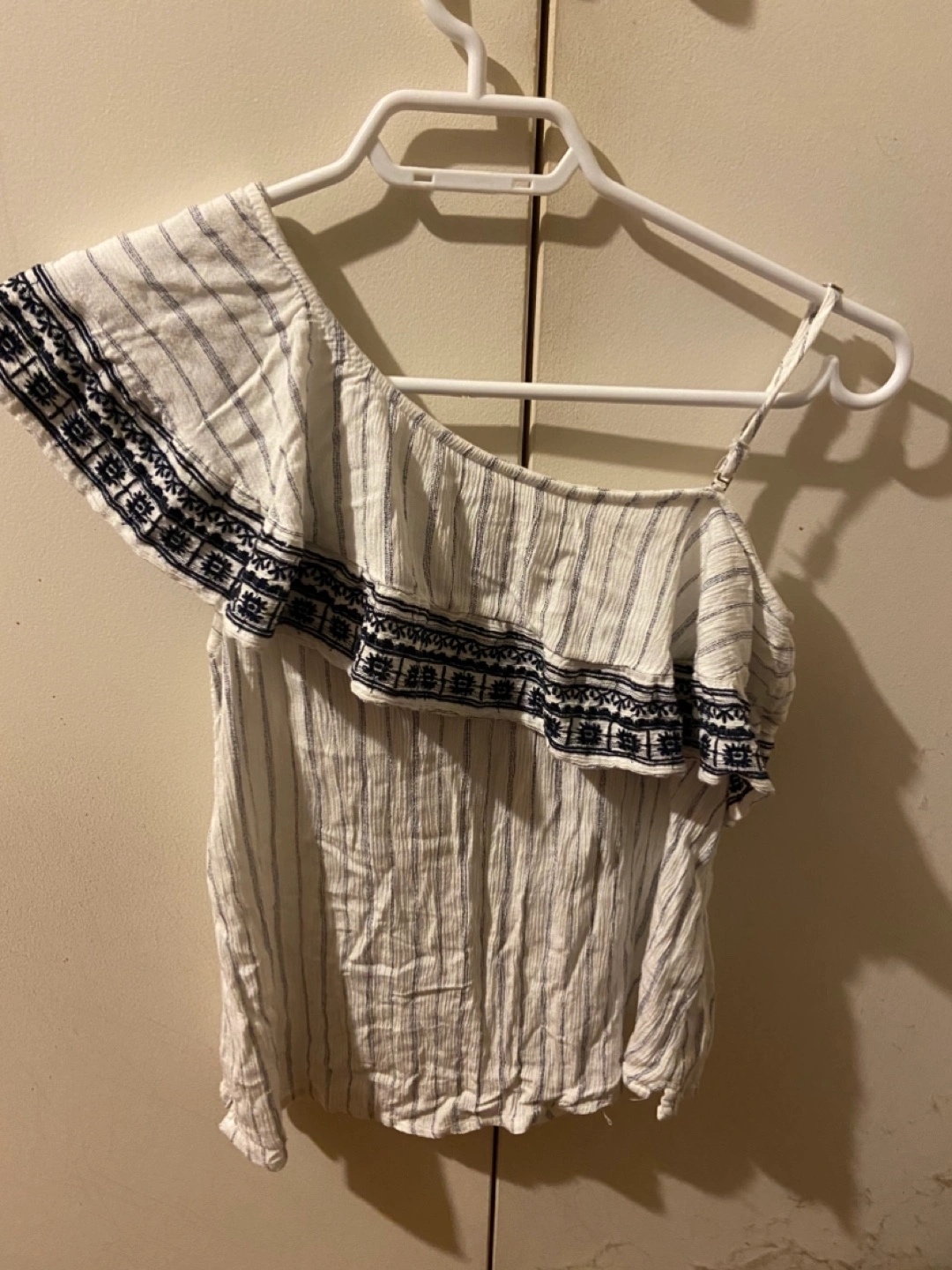 Here's a cute Abercrombie & Fitch top in size XS! It's white with thin stripes and has a stylish one-shoulder design with an embroidered ruffle detail. Perfect for a casual summer look!