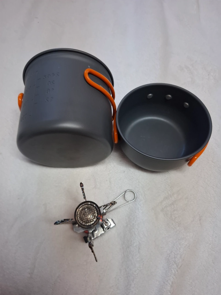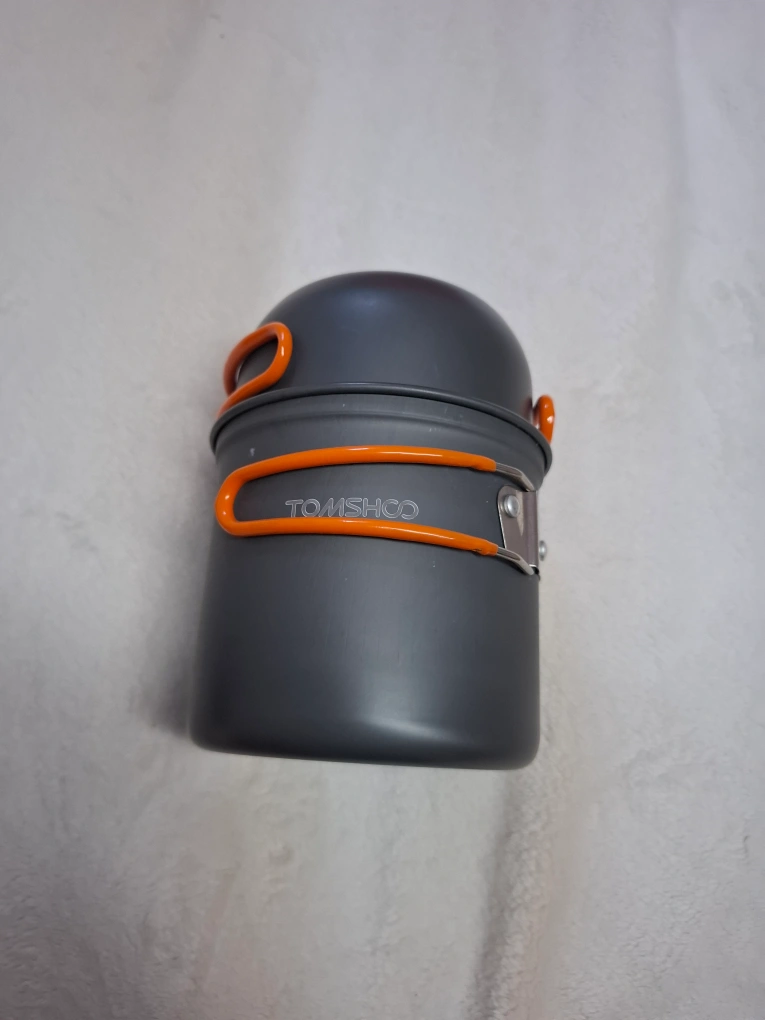 Selling a TOMSHOO camping cookware set! It includes a pot, pan, and a small stove. Perfect for backpacking or camping trips. Comes with a mesh carrying bag for easy storage and portability