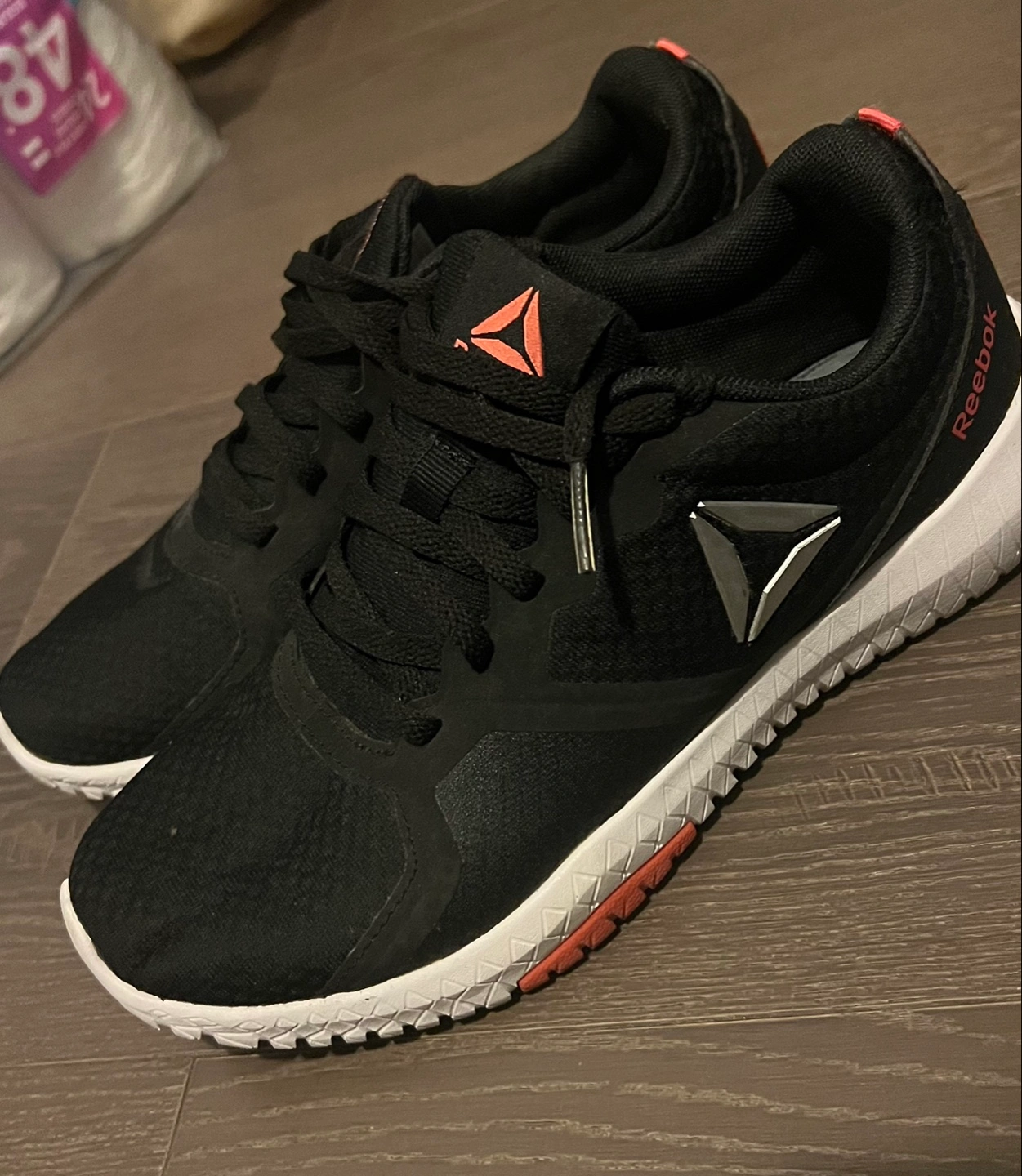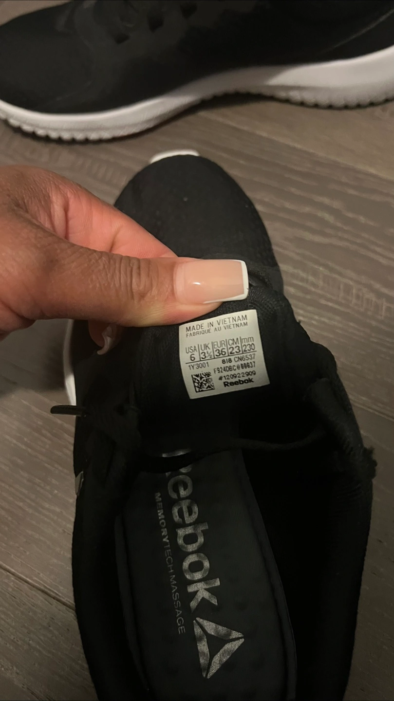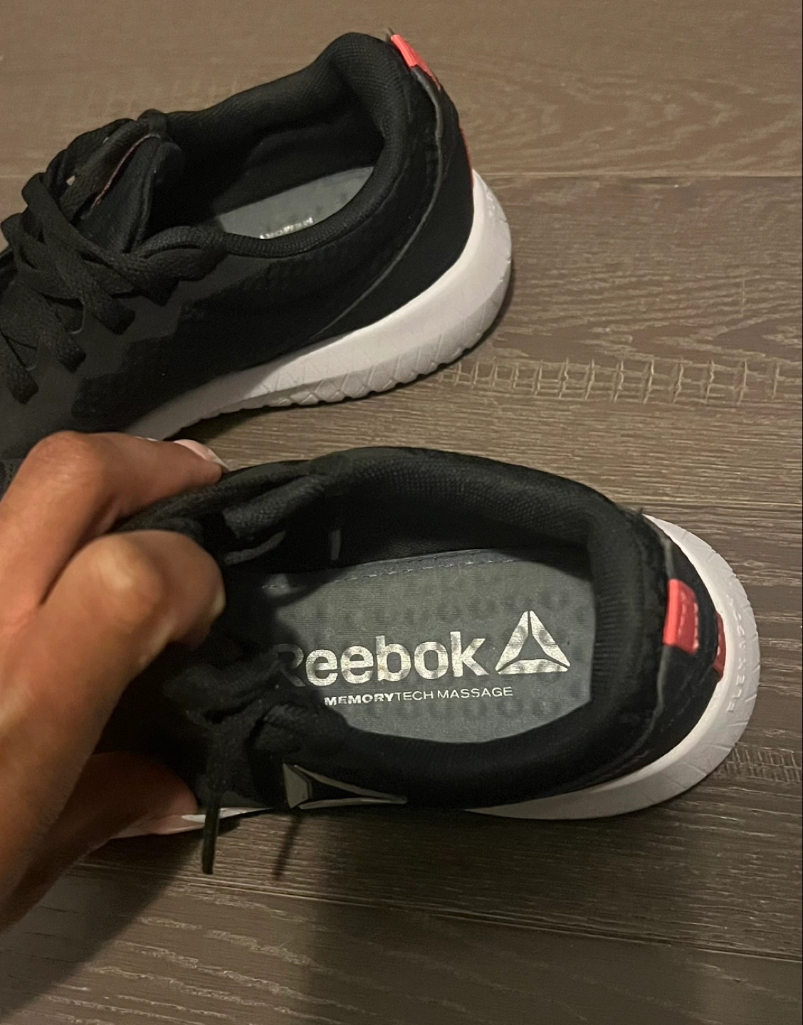 Selling a pair of Reebok women's shoes featuring Memory Tech Massage. They are black with a white sole and a touch of coral/red. Size is US 6.