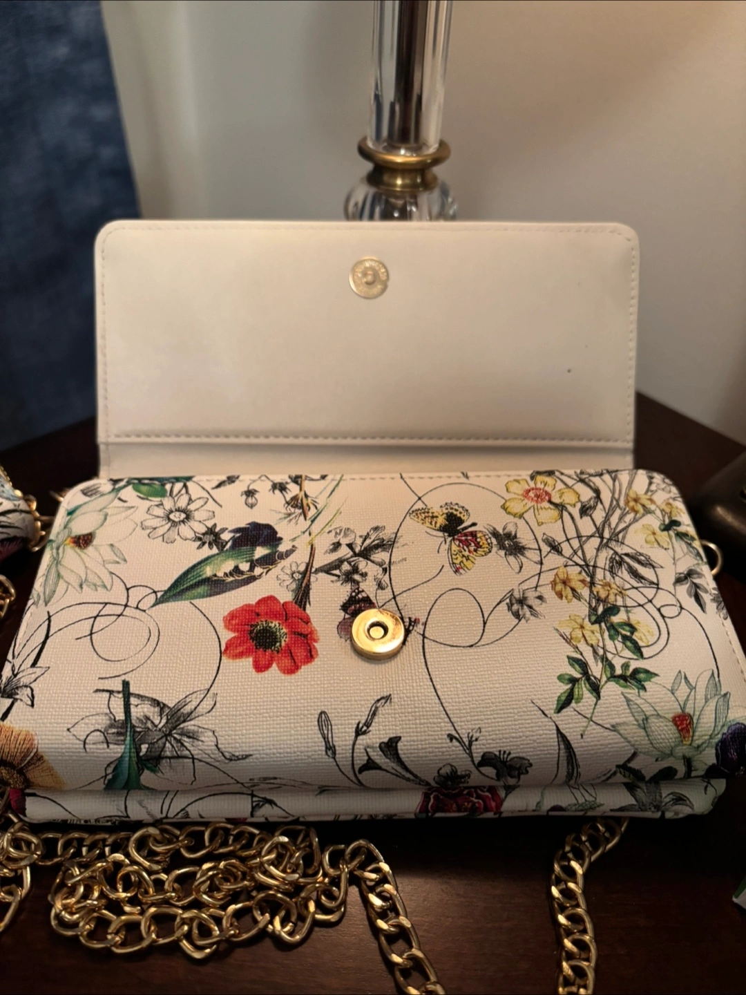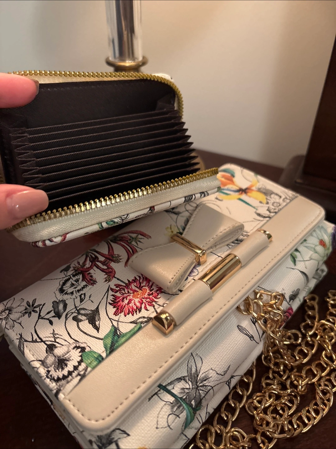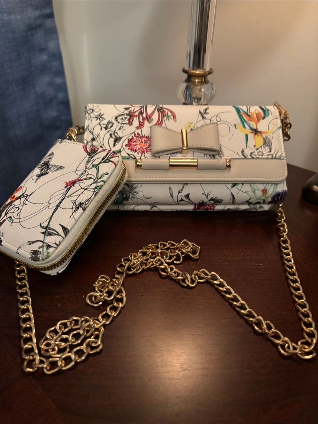 This is a cute crossbody bag with a floral print! It has a chain strap and a matching small wallet. The bag has a bow detail on the front and is in great condition. Perfect for adding a touch of style to your outfit!