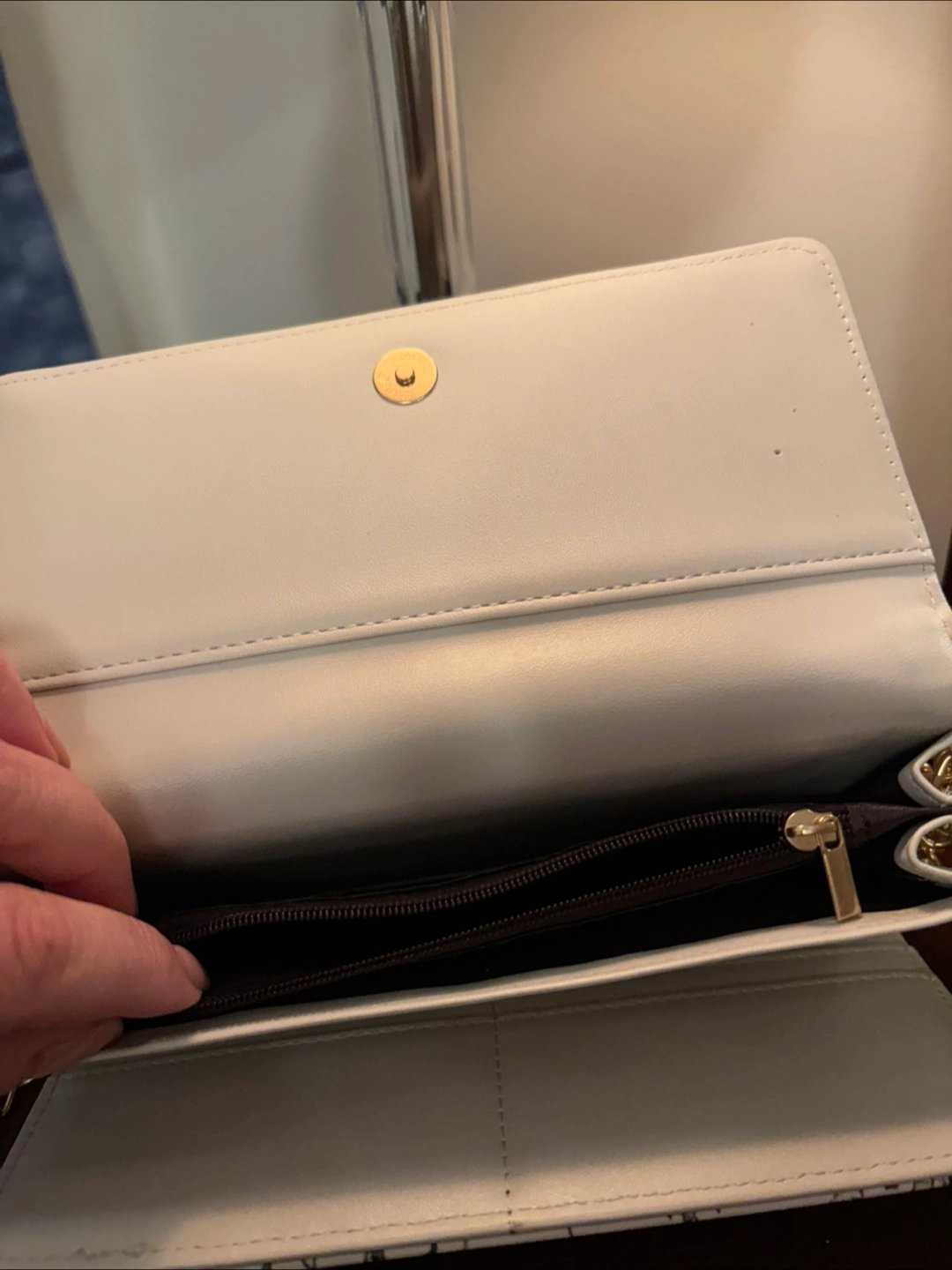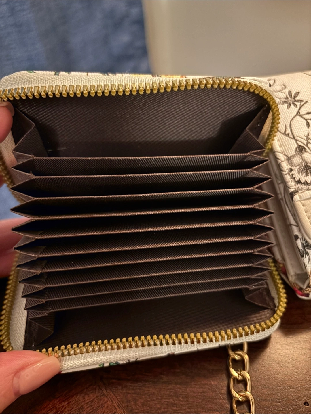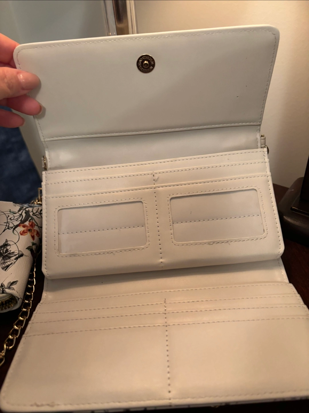 This is a cute crossbody bag with a floral print! It has a chain strap and a matching small wallet. The bag has a bow detail on the front and is in great condition. Perfect for adding a touch of style to your outfit!
