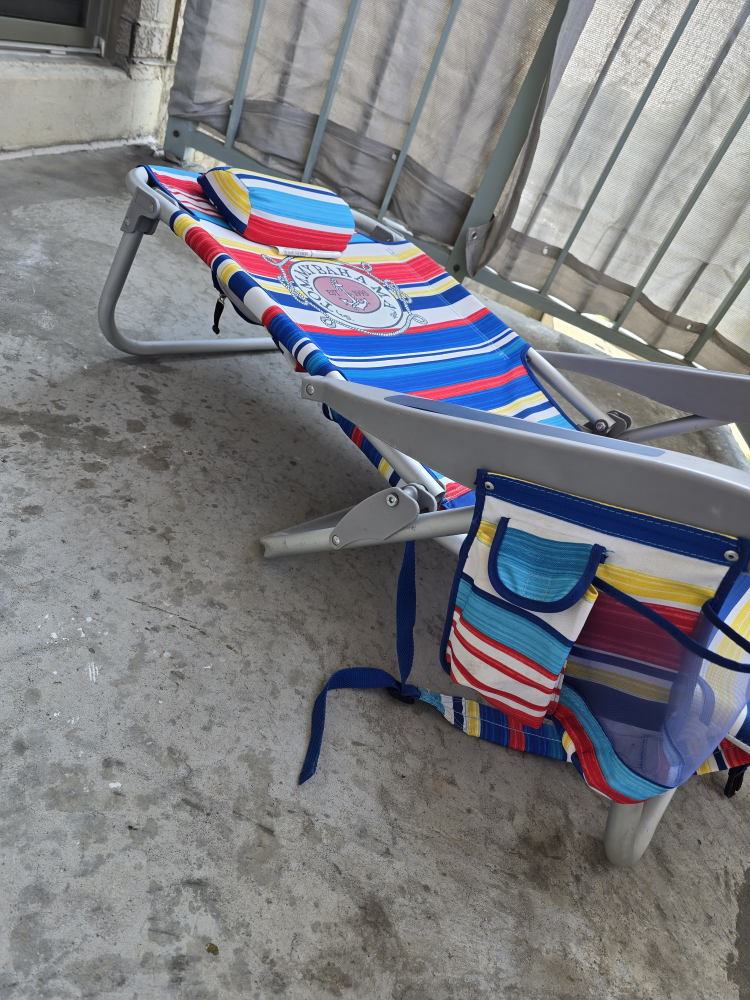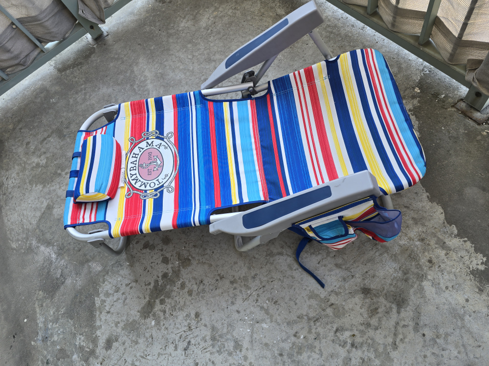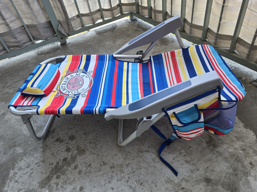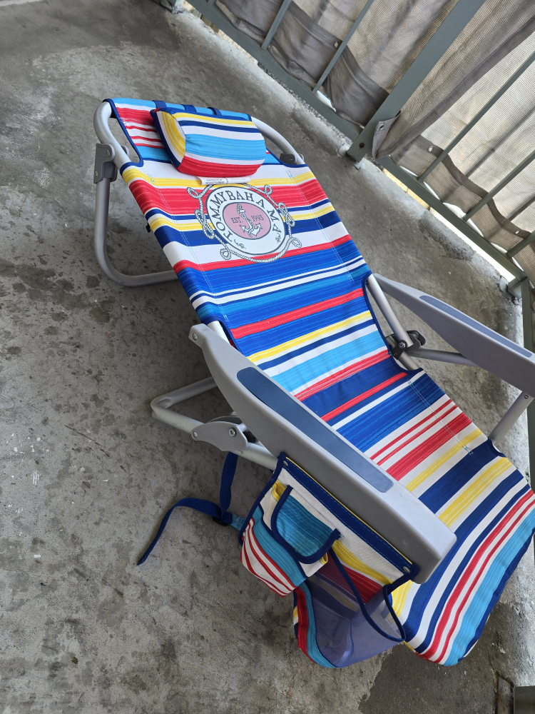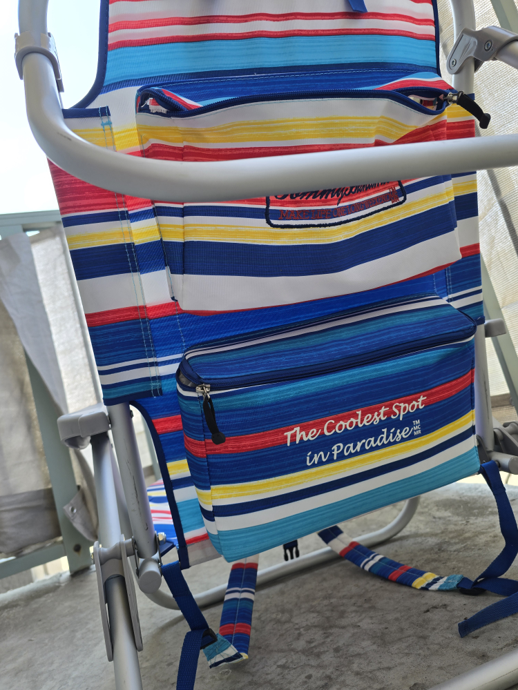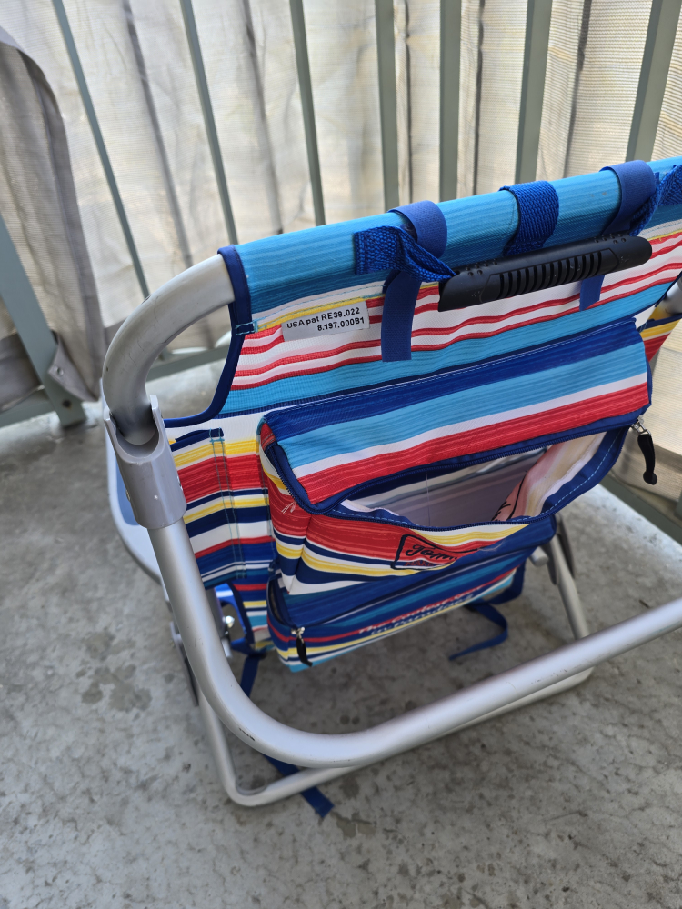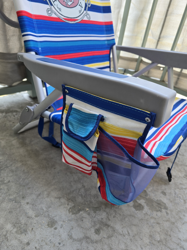 Get ready for summer with this Tommy Bahama beach chair! It features a colourful striped design and convenient pockets for your essentials. Perfect for relaxing at the beach or by the pool