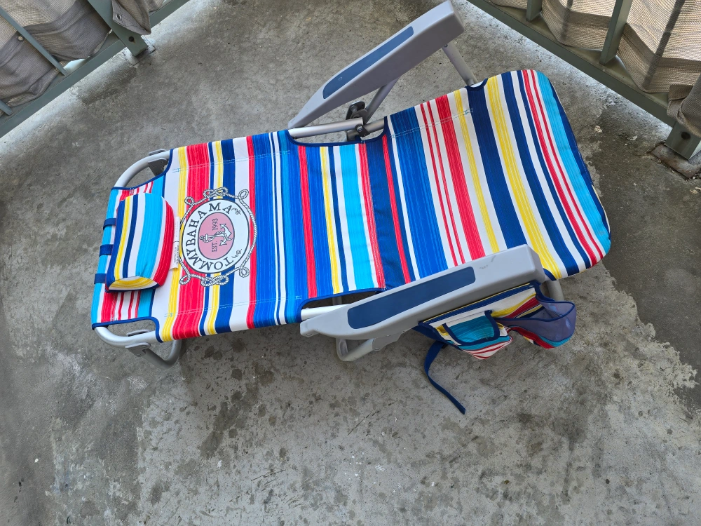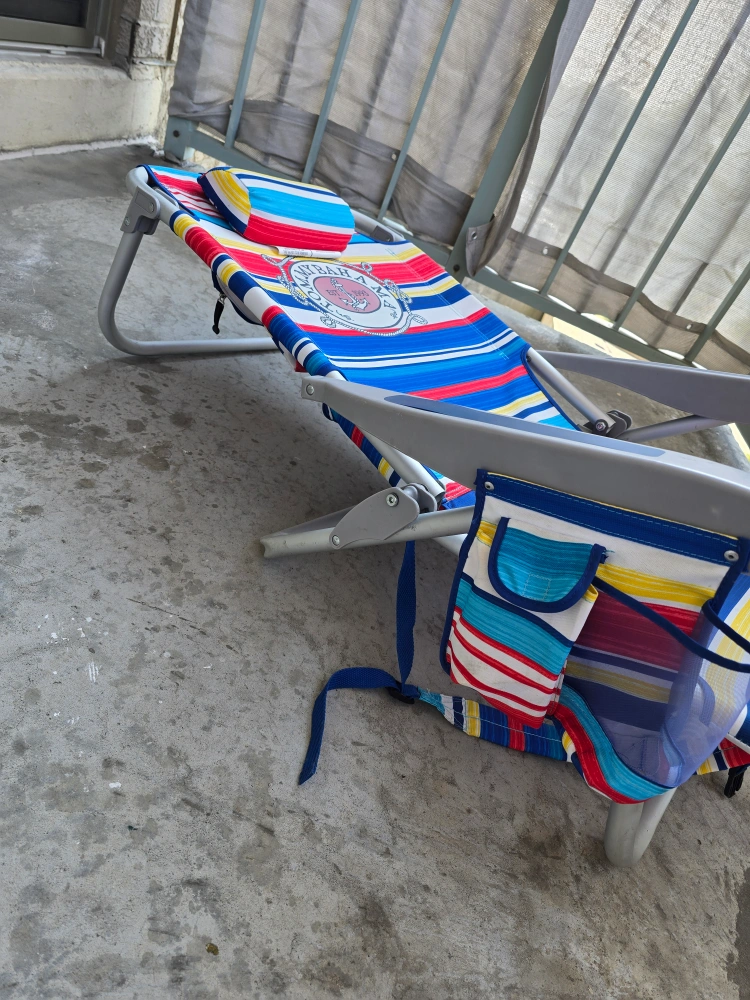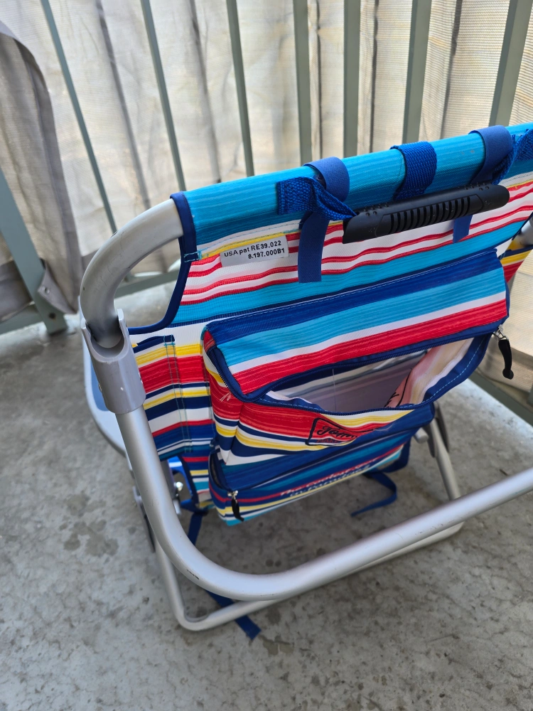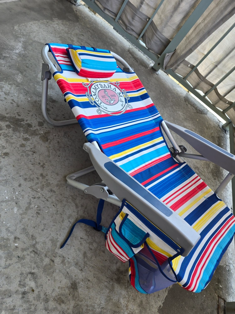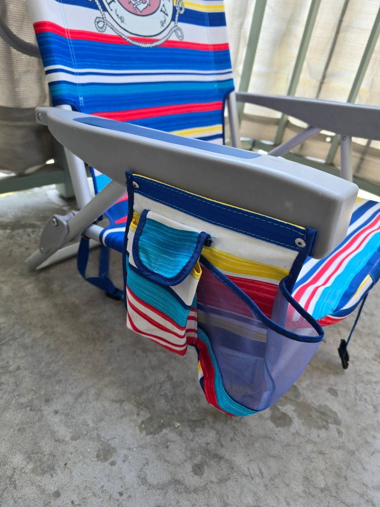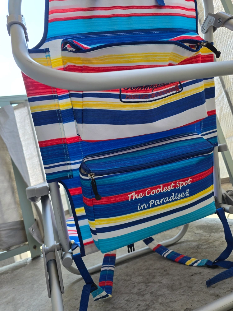 Get ready for summer with this Tommy Bahama beach chair! It features a colourful striped design and convenient pockets for your essentials. Perfect for relaxing at the beach or by the pool