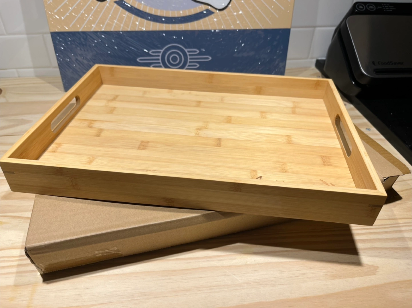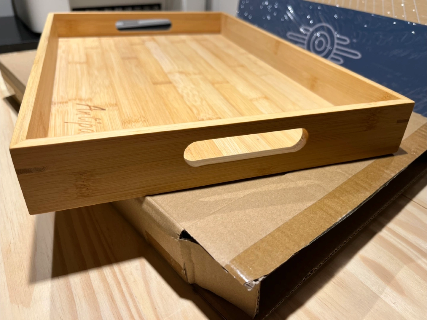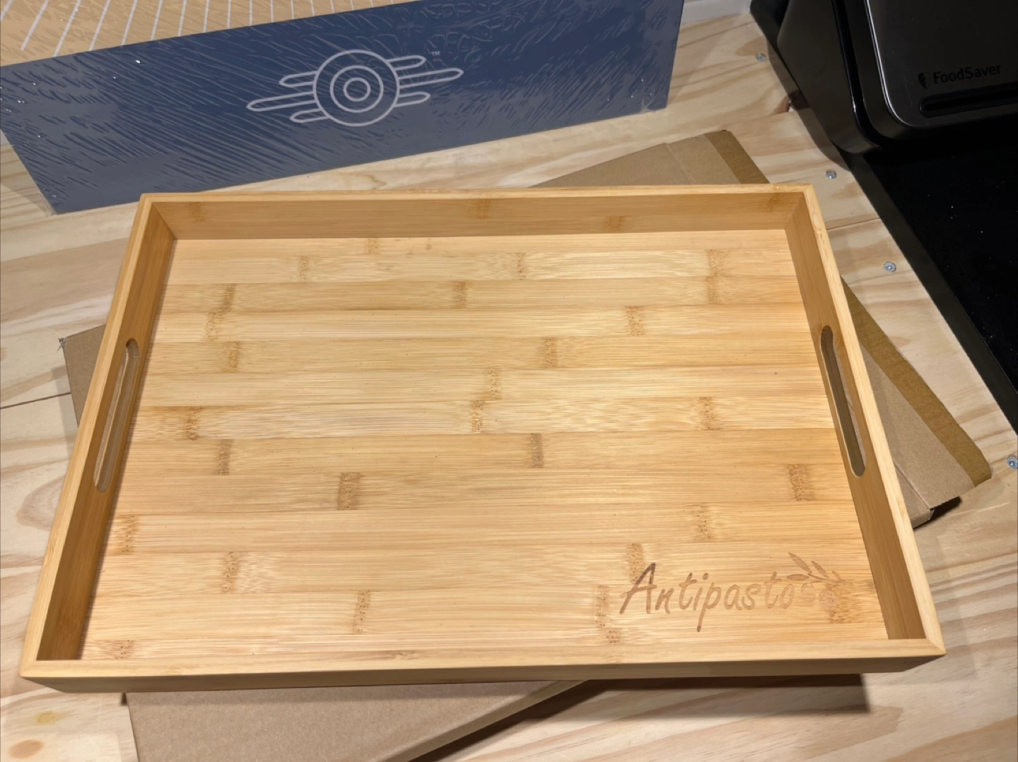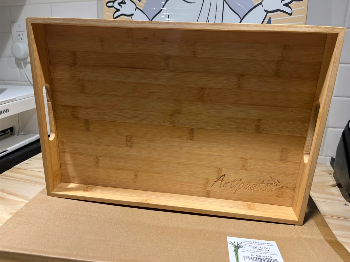 Selling a lovely bamboo tray, perfect for serving up snacks or breakfast in bed! It's a light, natural wood colour and has convenient handles on each side. The word "Antipasto" is engraved on the surface. It comes with its original box