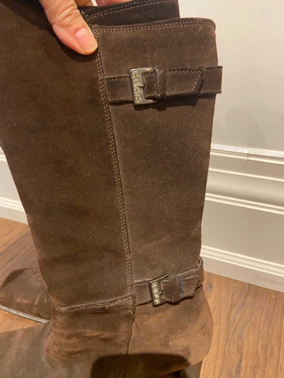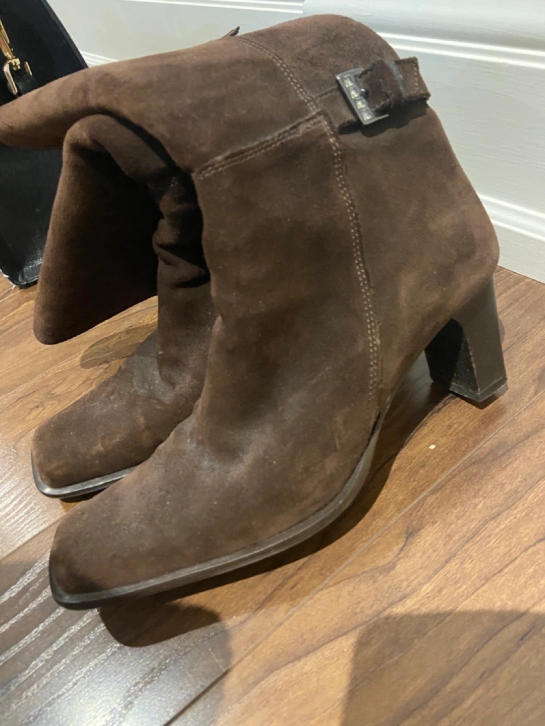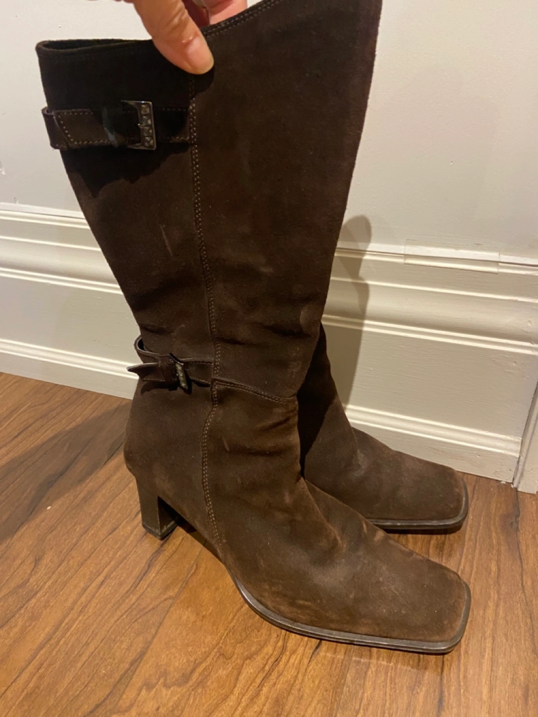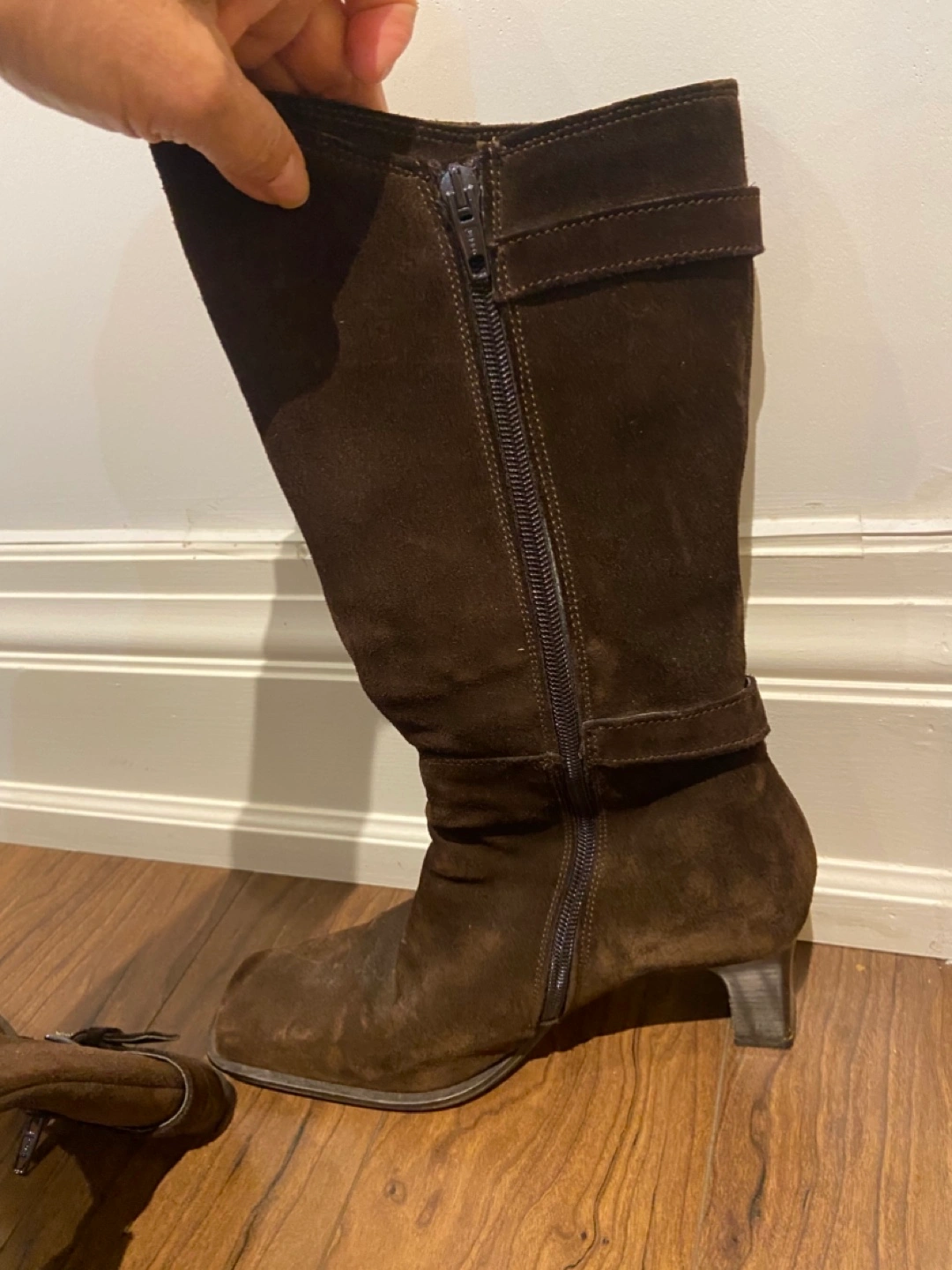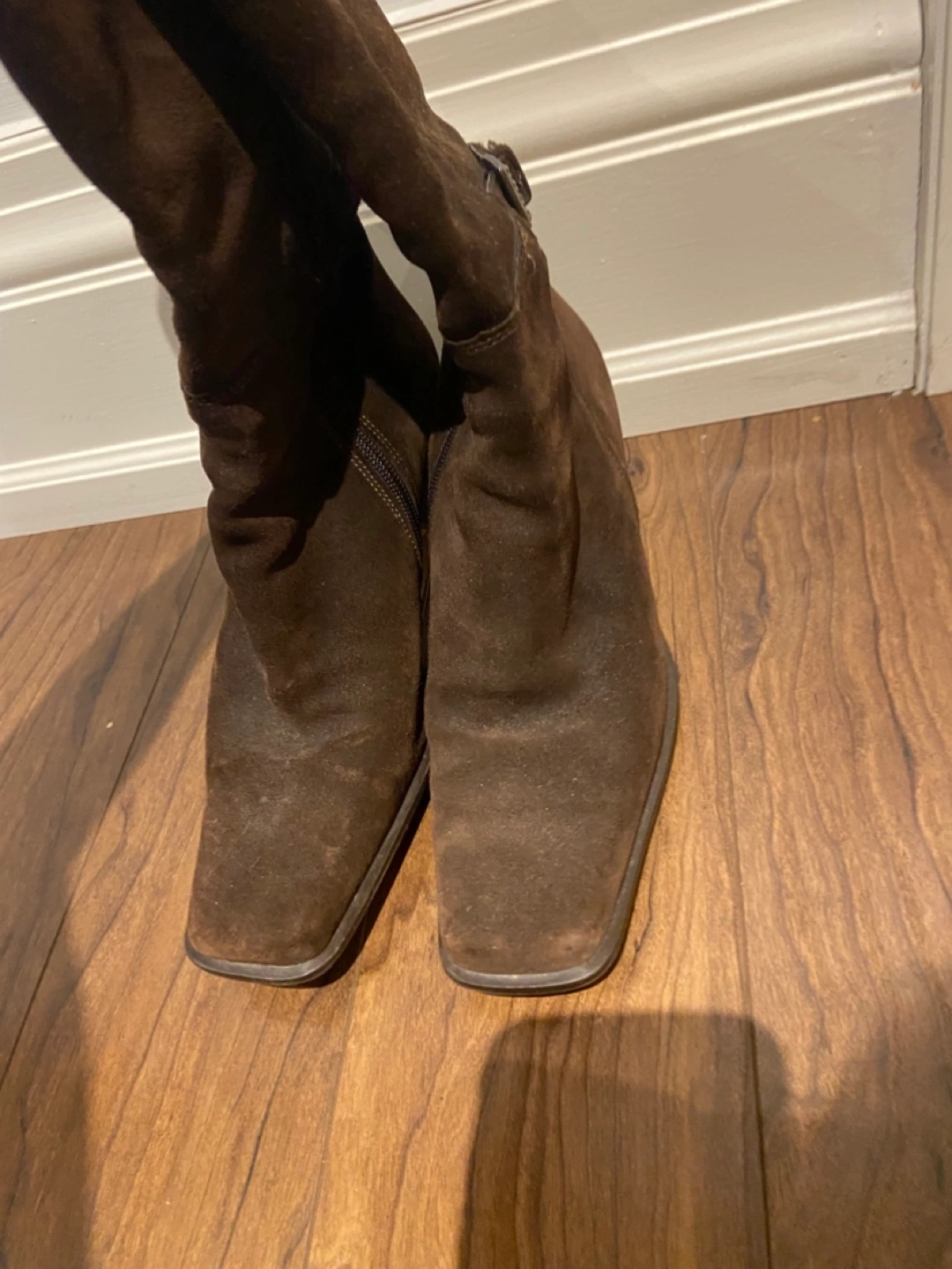 Selling a pair of brown genuine suede knee-high boots in size 7. They're in good condition, sooo comfortable have a stylish buckle detail. Perfect for adding a touch of elegance to your outfit!