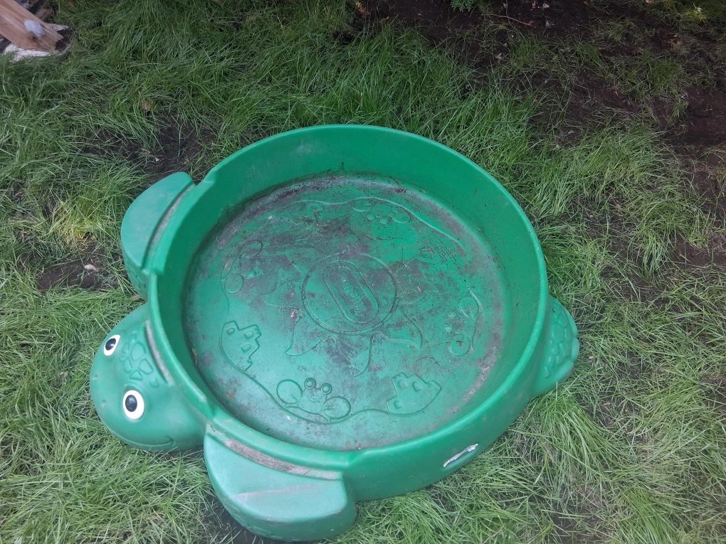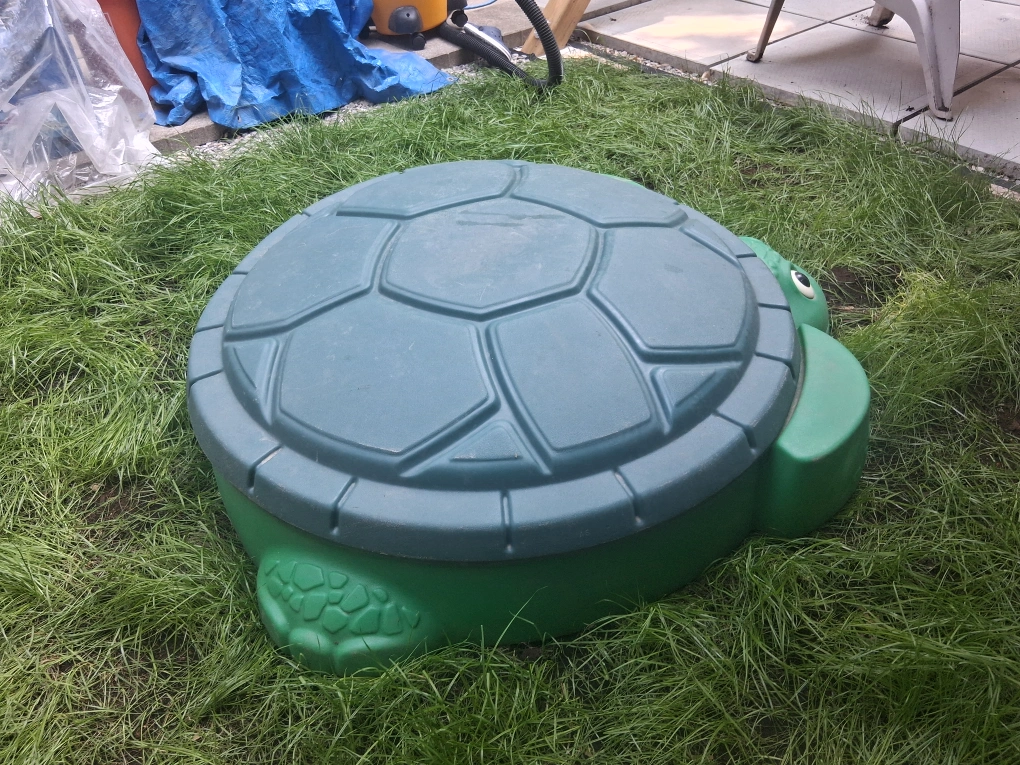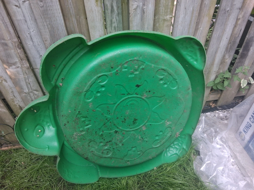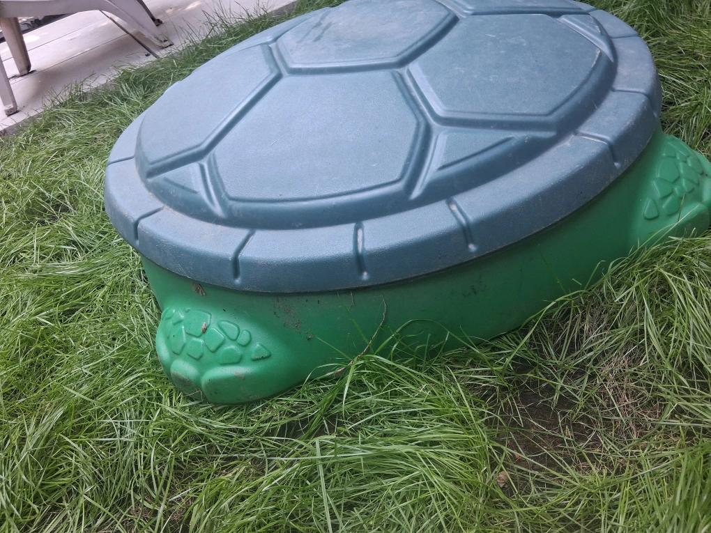 Here's a turtle-shaped sandbox, perfect for some outdoor fun! It's green and has a lid to keep the sand clean. It's in used condition, but still has lots of life left for your little ones to enjoy