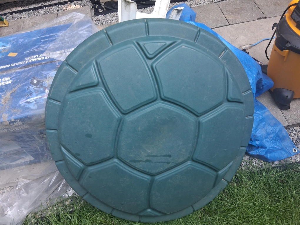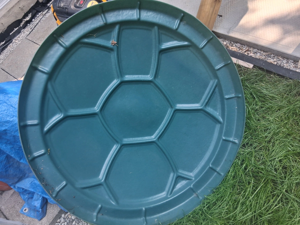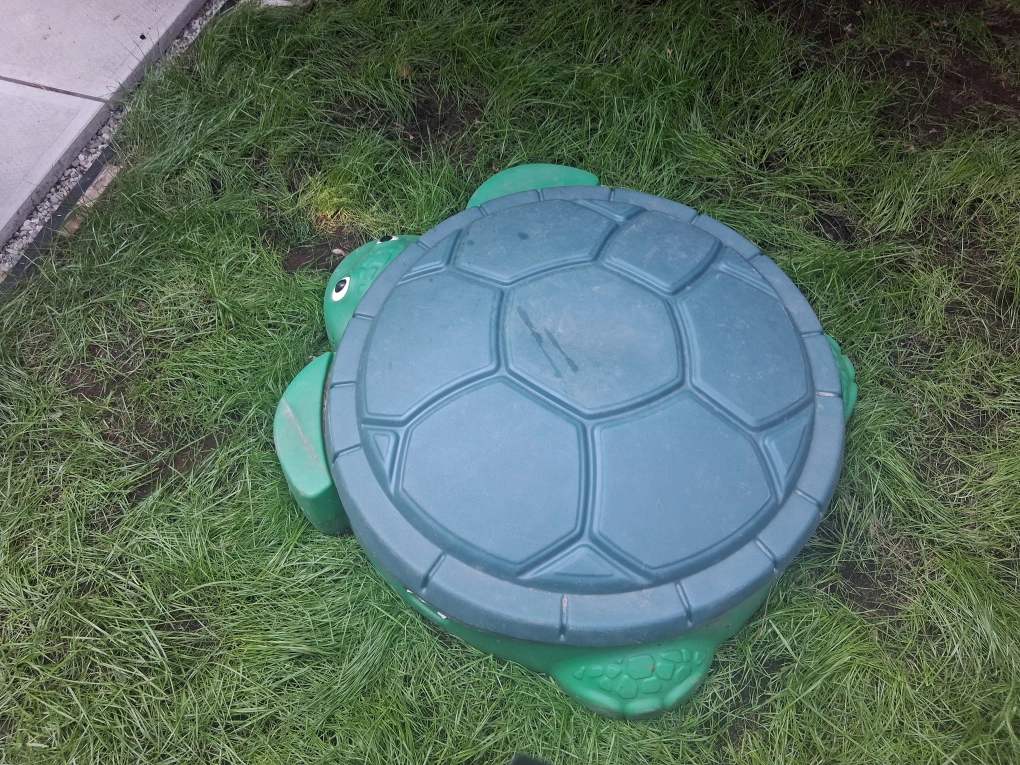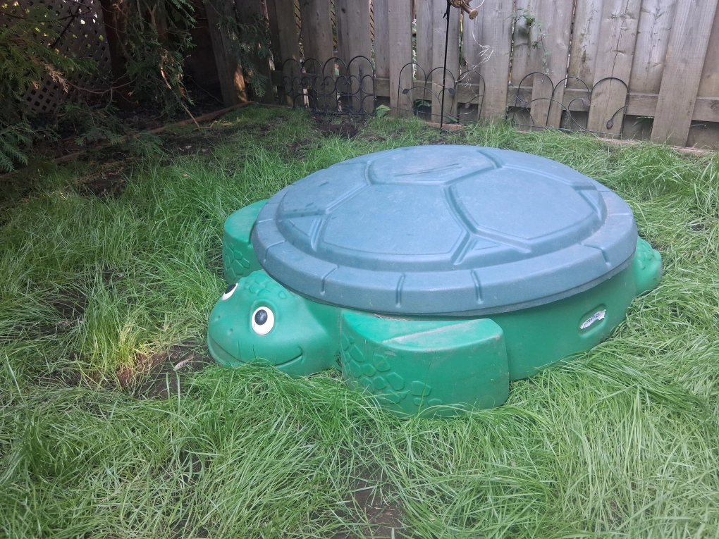 Here's a turtle-shaped sandbox, perfect for some outdoor fun! It's green and has a lid to keep the sand clean. It's in used condition, but still has lots of life left for your little ones to enjoy