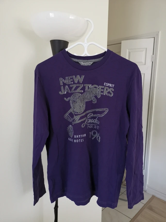 Here's a cool purple long sleeve shirt from Esprit! It features a unique design with "New Jazz Tigers" and "London Night 196" graphics. Perfect for adding a touch of retro style to your wardrobe. Size is small