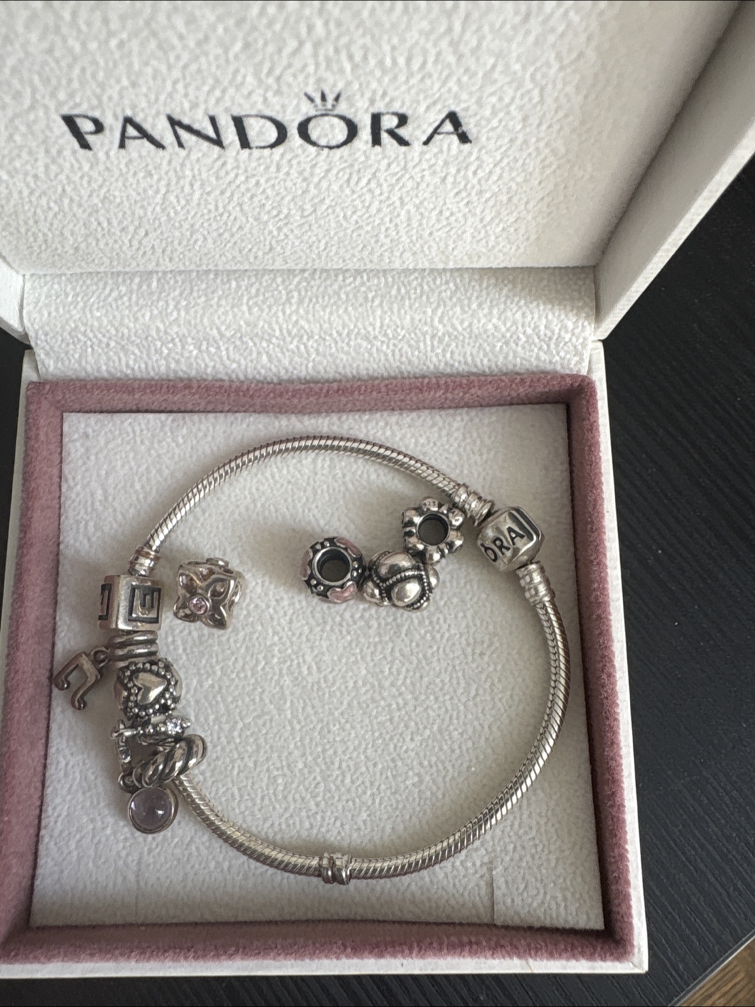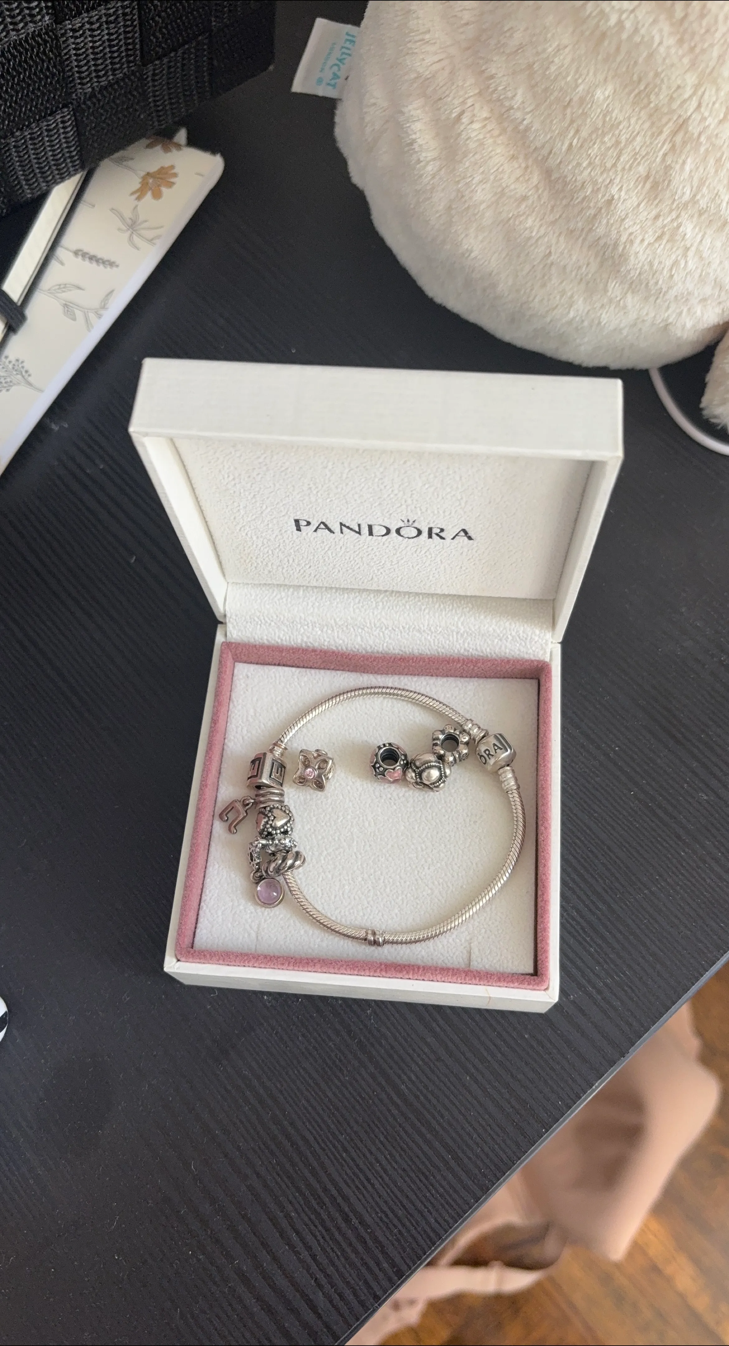 Selling a lovely Pandora bracelet that comes with a few charms and its original box! It's in great condition and ready for a new home. Perfect for adding to your collection or starting one