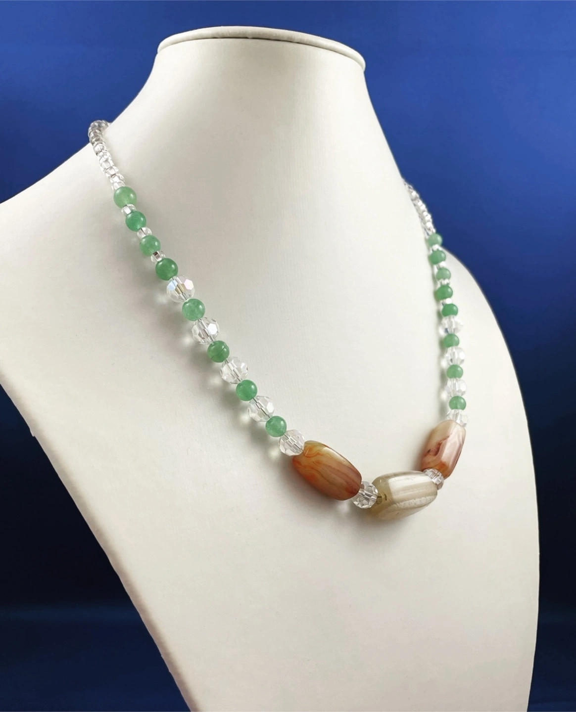 This necklace features 3 agate stones flanked by green aventurine and glass crystal beads with a sterling silver barrel clasp.