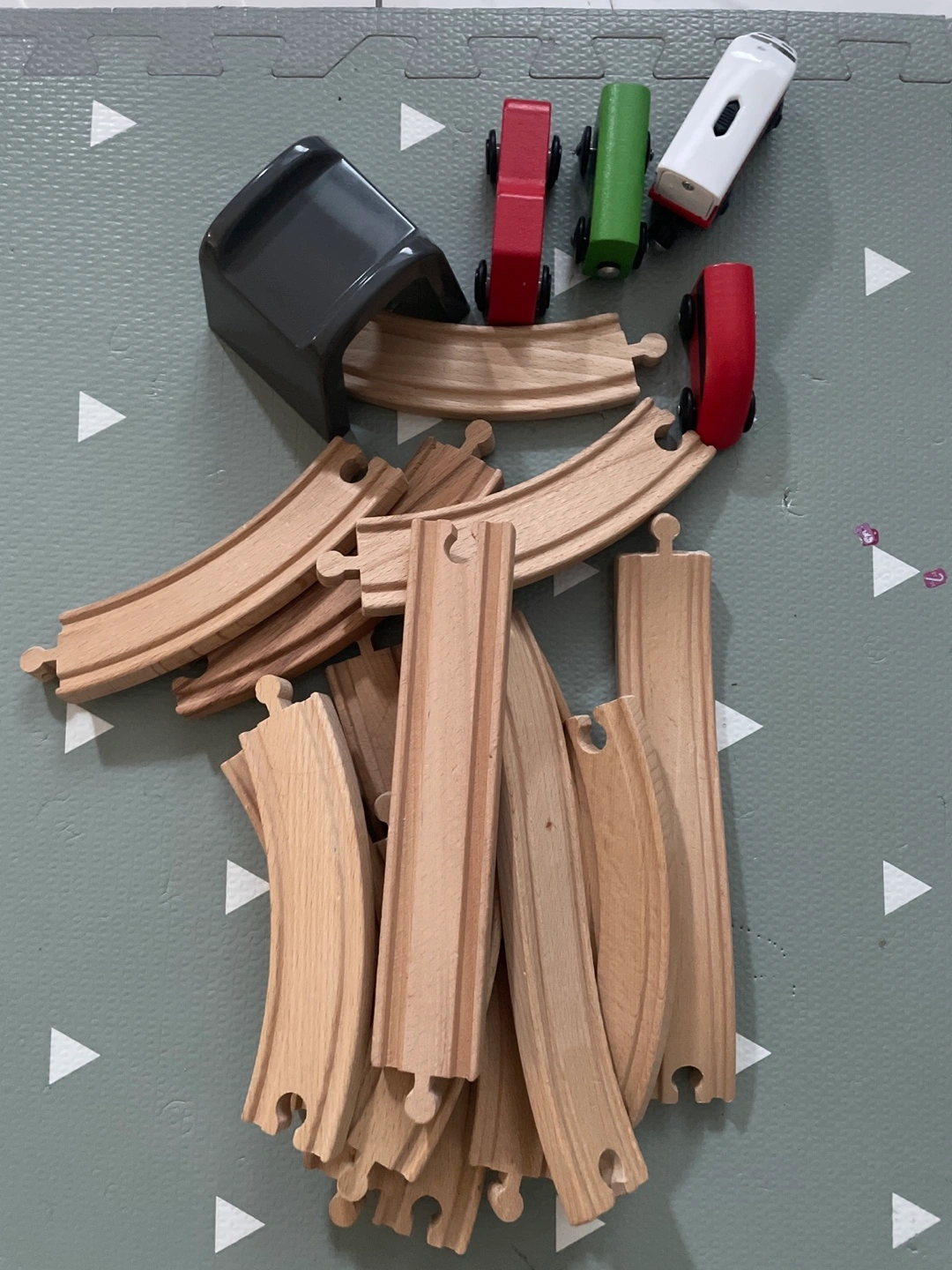 Here's a fun wooden train set! It includes tracks, a tunnel, and several train cars in red, green, and white. Perfect for hours of imaginative play!