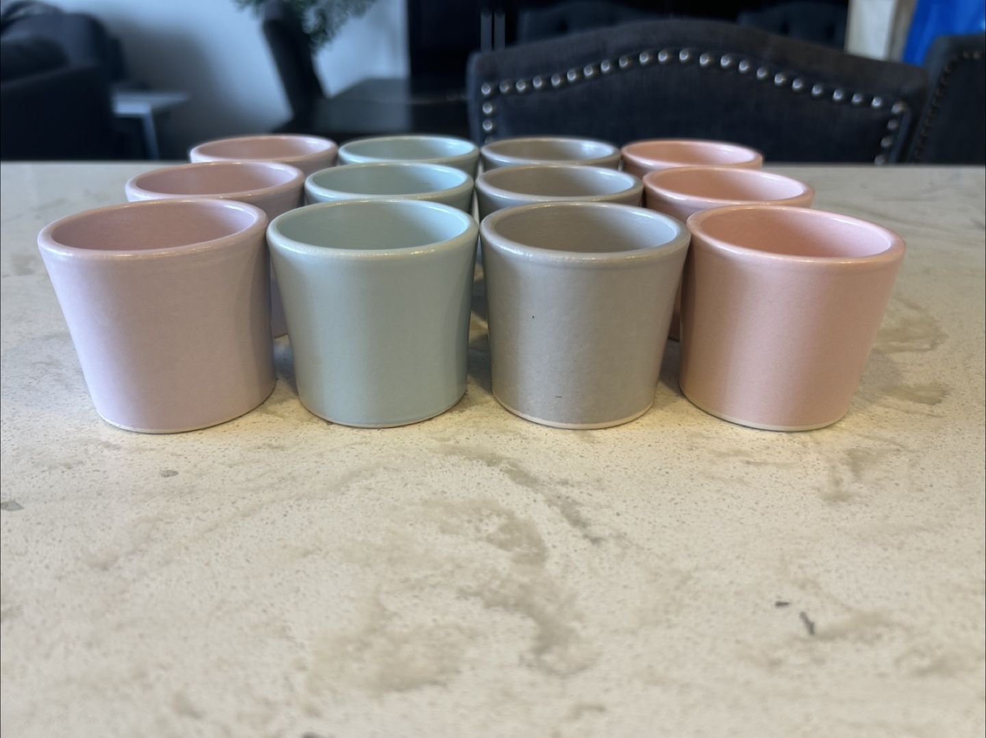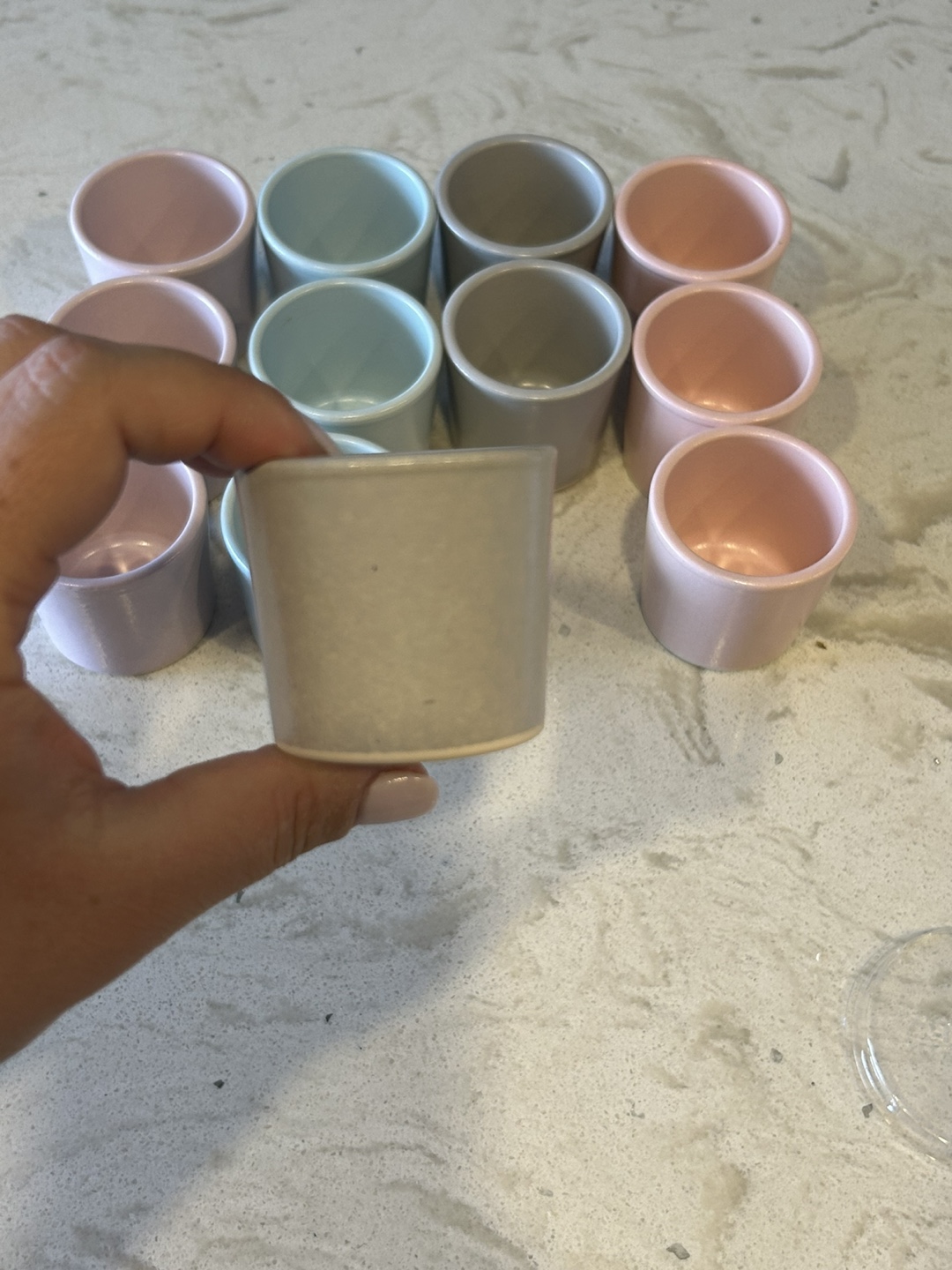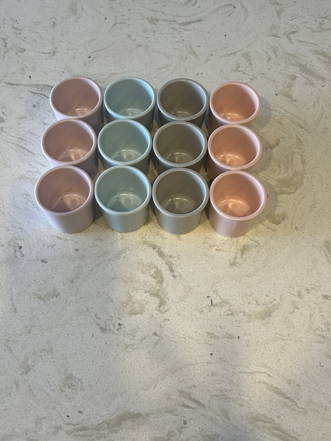 Selling a set of small ceramic cups in various pastel colours. Lilac, light blue, gray and pink. They're in excellent condition and ready for a new home!