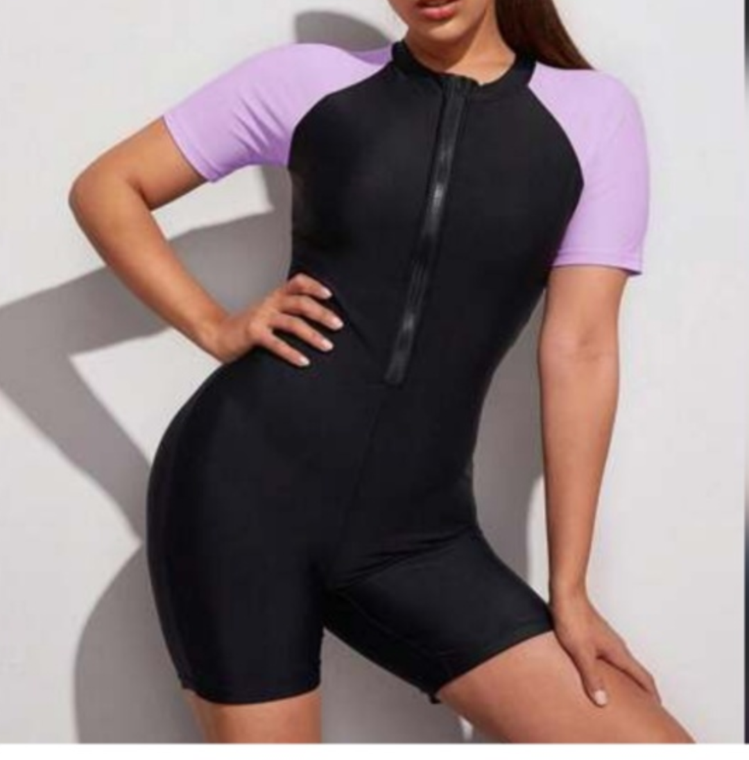 Selling a cute swimsuit with short sleeves! It's black with lavender sleeves and has a zipper in the front. Perfect for swimming or other water activities!