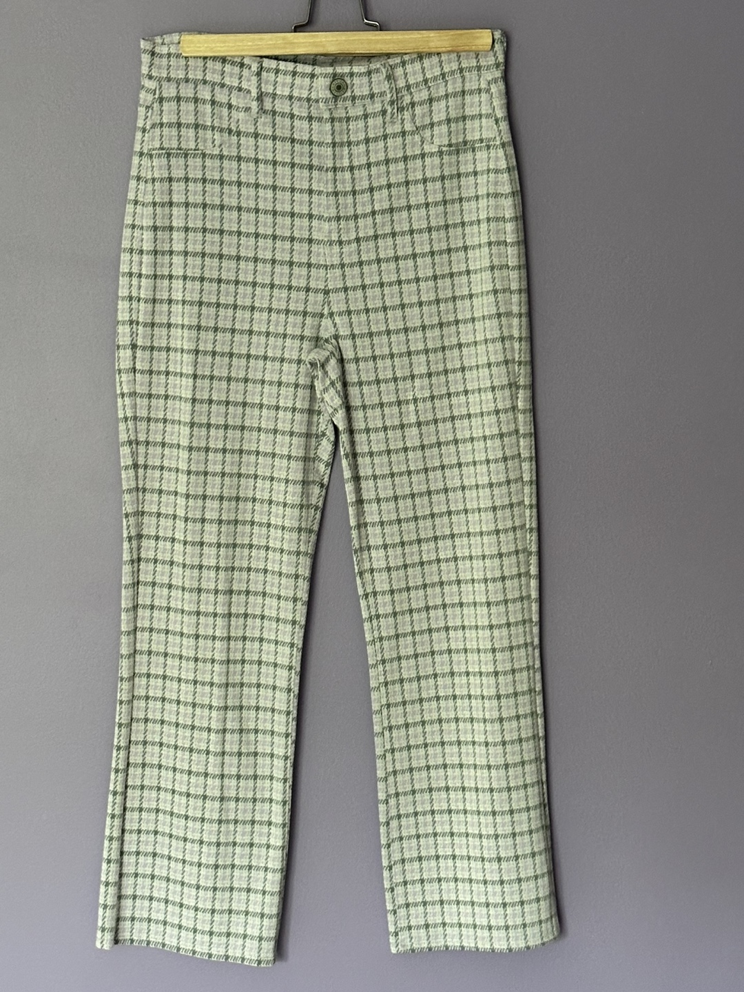 Cute pair of plaid trousers! They feature a purple and white checkered pattern. Perfect for a casual or dressed-up look