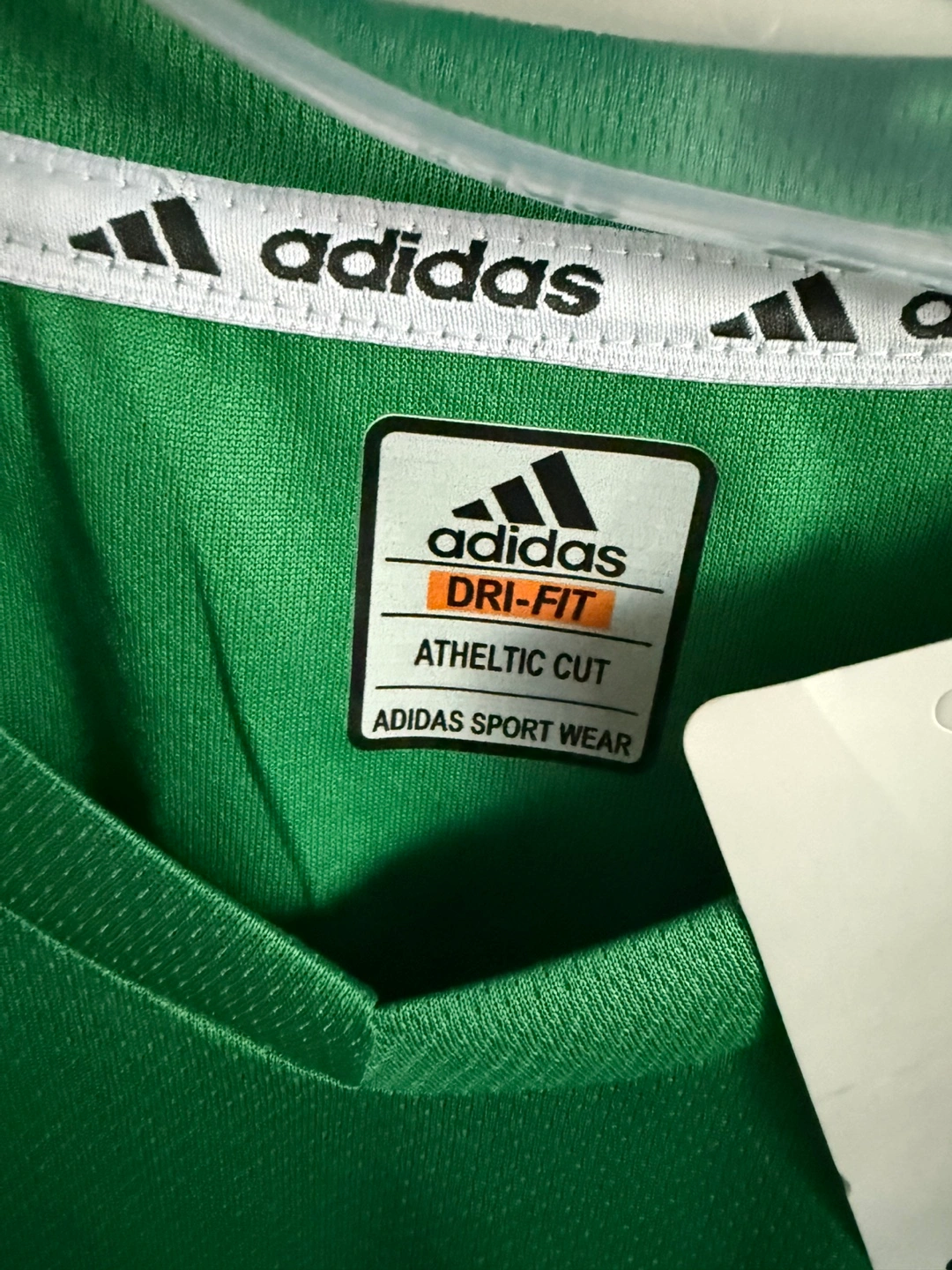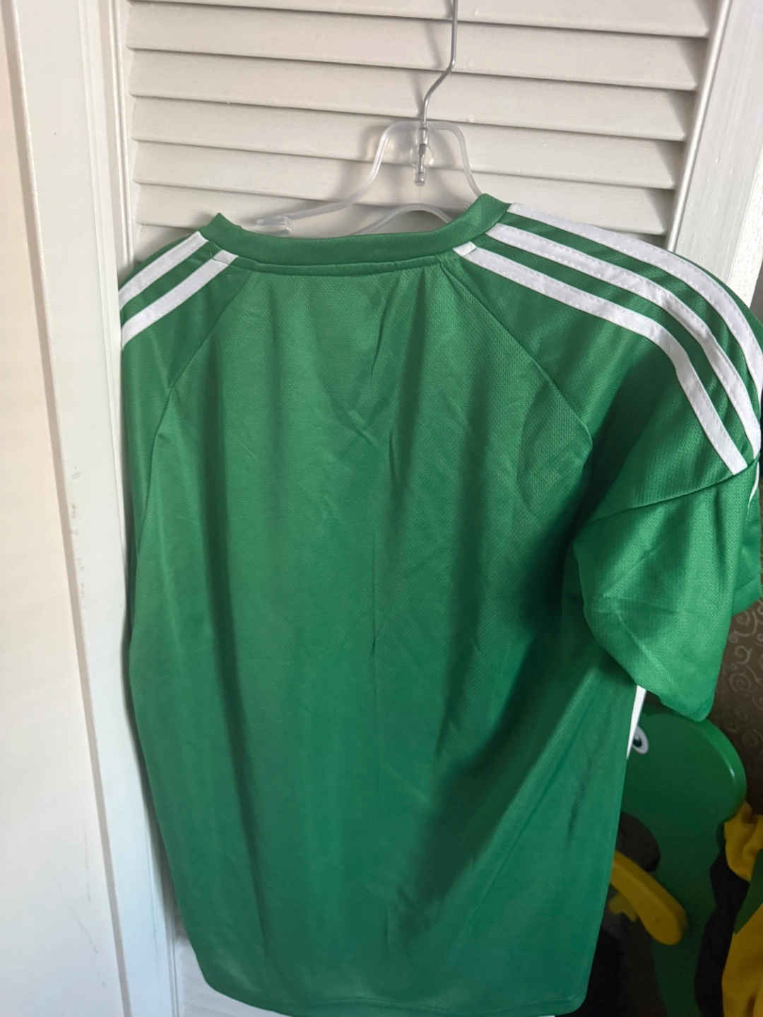 Selling a brand new Adidas Iraq soccer jersey! It's a vibrant green with the classic Adidas stripes on the shoulders. Features the Iraq emblem on the chest. Perfect for any soccer fan!