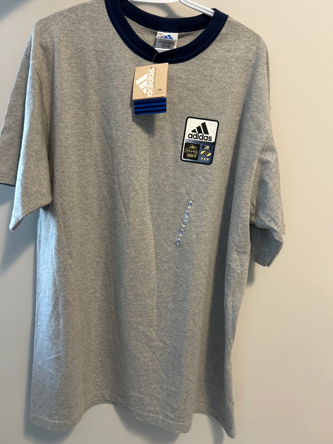 Selling an Adidas Forever Sport tee in size L. It's a grey colour with a cool design on the front and back. Perfect for casual wear or working out!