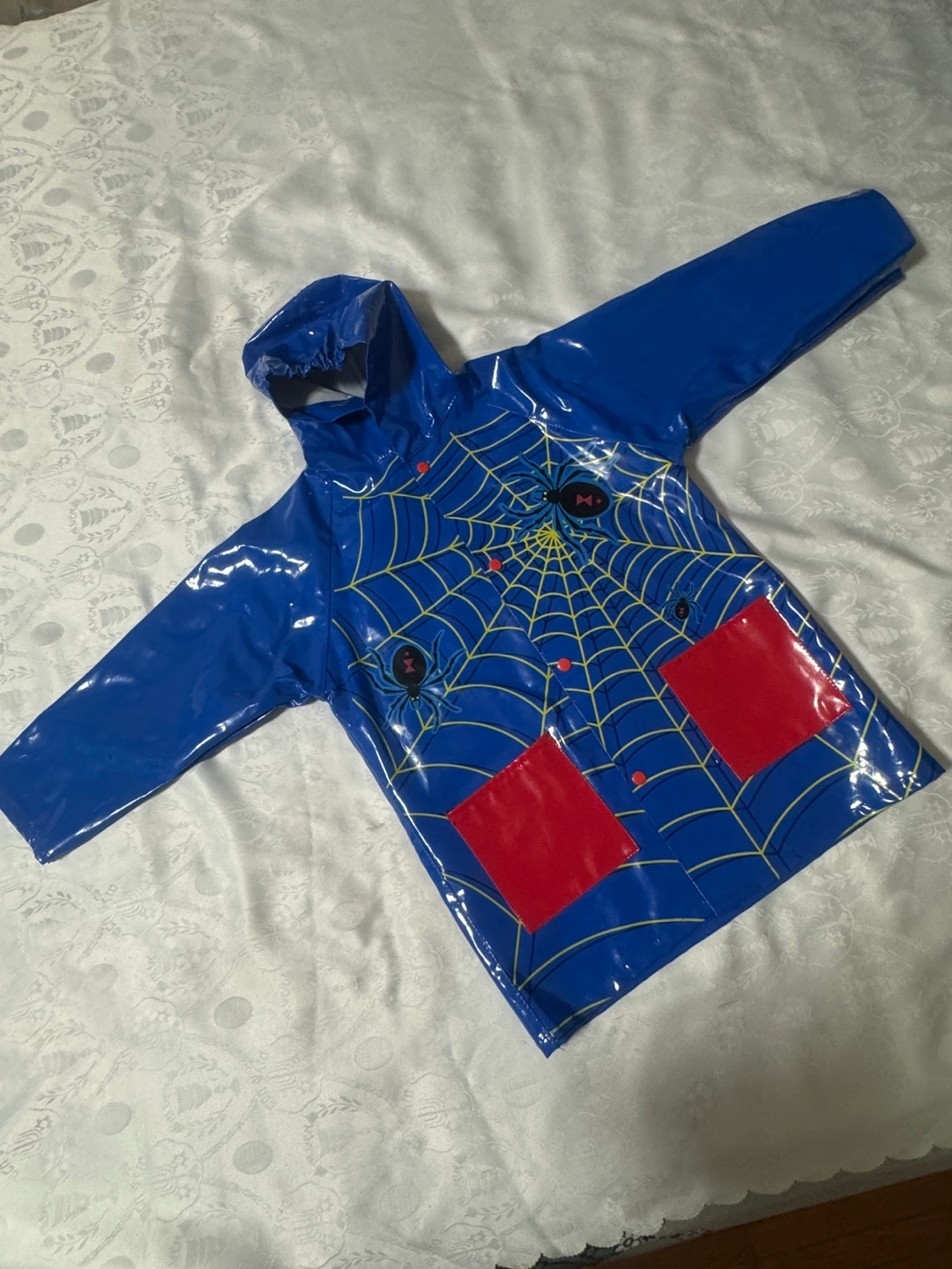 (Location Midland and Lawrence ). A Preloved in ver good condition, super cute blue raincoat with a fun spiderweb design! It has red pockets and is perfect for keeping your little one dry on rainy days. Porch Pick up . Cash only plz . Serious Inquiries only.
