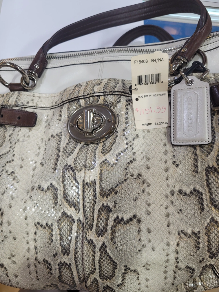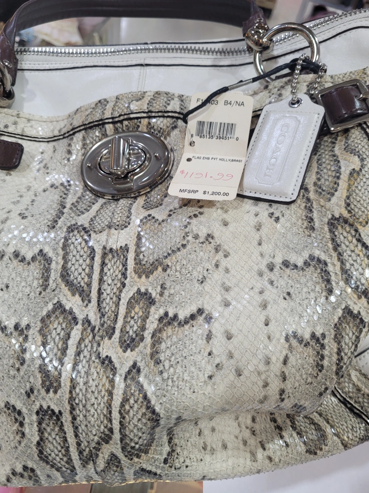 Selling a Coach handbag with a snakeskin print! It's in great condition and has a unique look. The model number is F16403 B4/NA. The tag shows an original price of $1191.99 and an MSRP of $1200